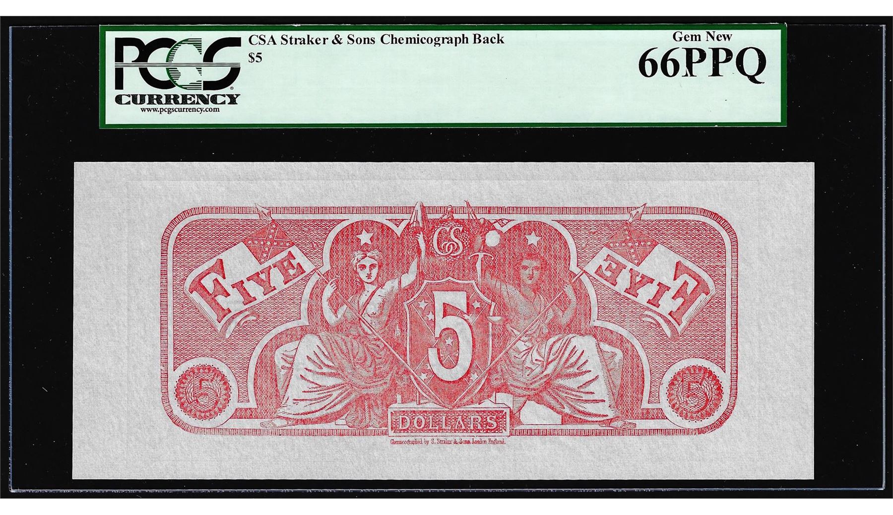 One $5 Chemicograph Back Confederate Currency Note PCGS Gem New 66PPQ. PCGS Graded.