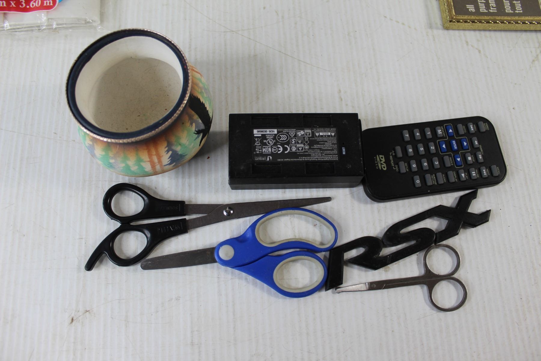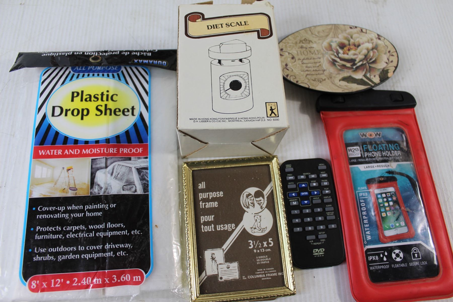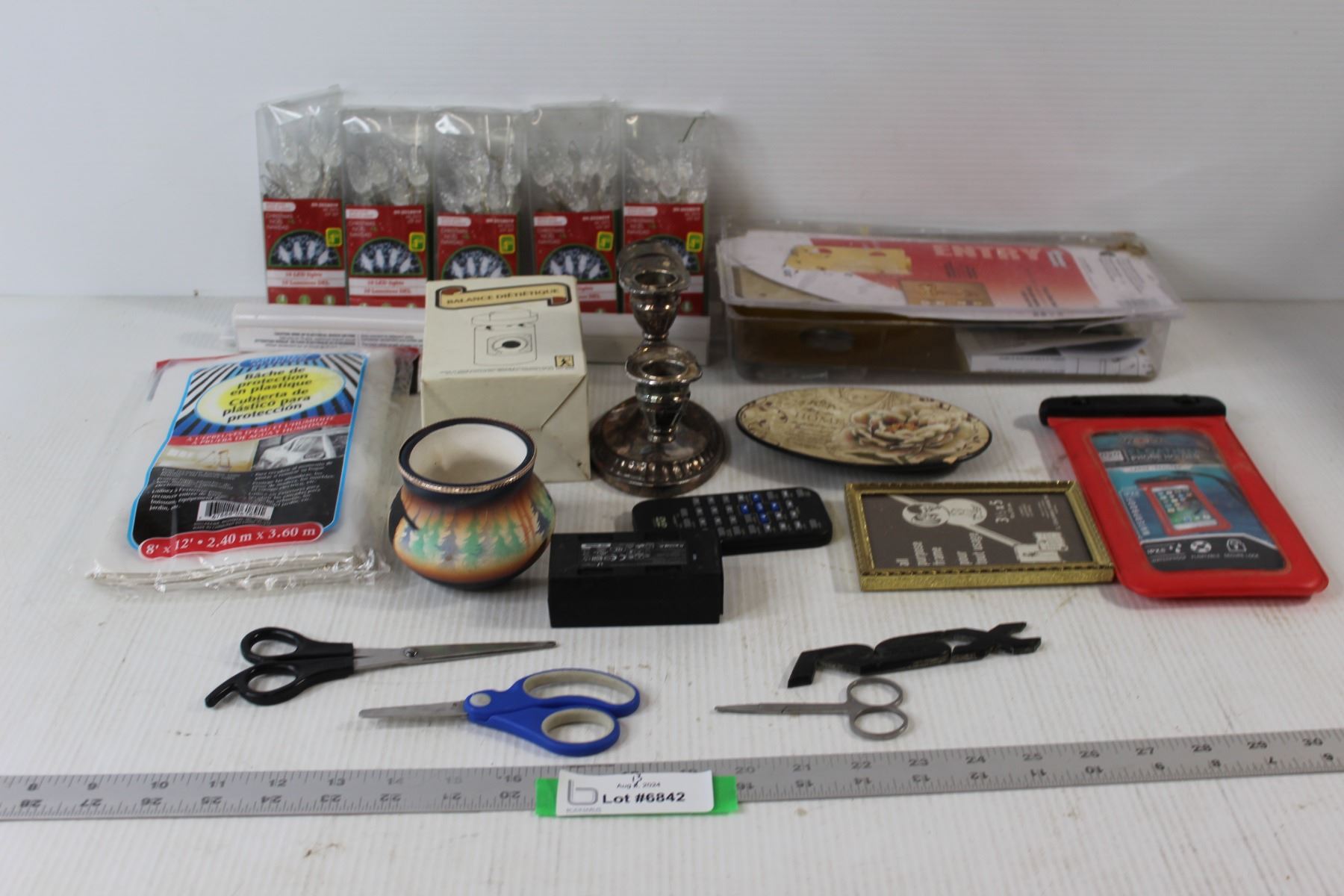 (5) Christmas Light Packs, Door Handle and lock, Picture Frame, Tray, DVD Remote, Diet Scale, Candle Holder, Floating Phone Holder, Plastic Drop Sheet, (3) Scissors