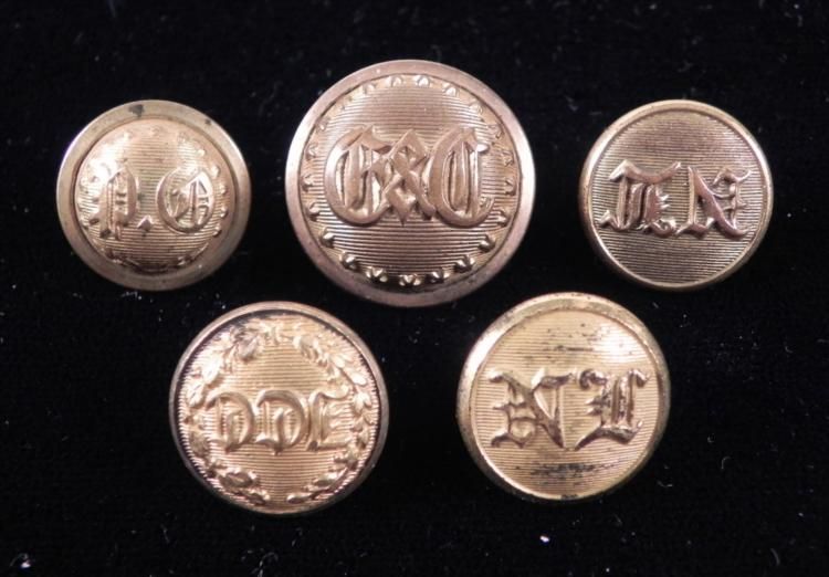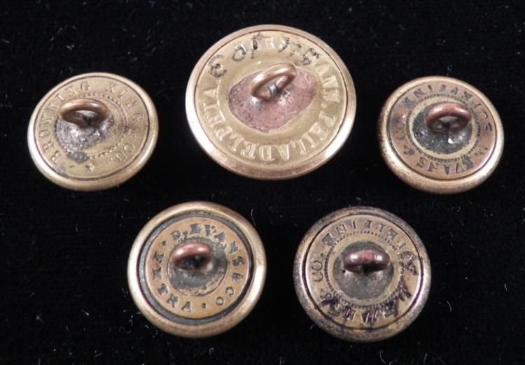 5 Civil War or Post Civil War Military Antique Gilt Coat Buttons * Obverse: Monograms or different types, some featuring laurels or starsReverse: HORSTMANN PHILADELPHIA, BROWNING KING & CO., EVANS & CO., Diameter: 15-20 mmCondition: Very Good to Excellent