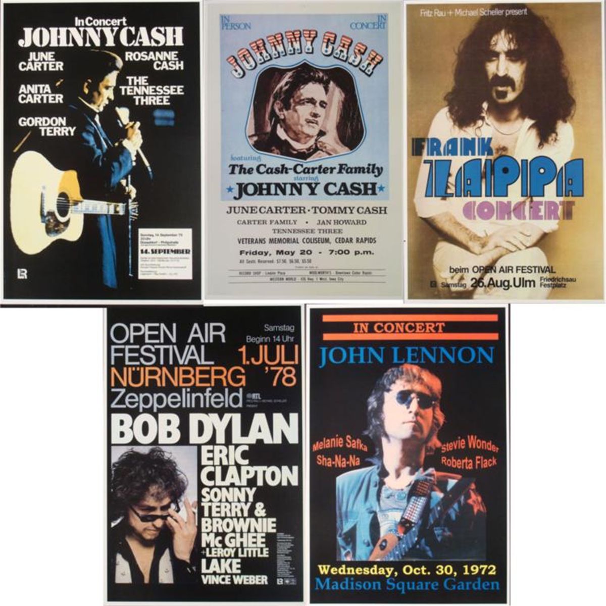 These 5 reproductions of original concert posters are from some of the most influential figures of music. * Condition: Excellent Size: 12" x 18" Posters: Johnny Cash, with others (Dusseldorf, Germany, September 14, 1975)Johnny Cash featuring the Cash-Carter family (Cedar Rapids, Iowa, May 20th)Bob Dylan, Eric Clapton, and others (Open Air Festival in Nurnberg, Germany, July 1st, 1978)John Lennon (Madison Square Garden, New York, October 30, 1972)Frank Zappa (Beim Open Air Festival, Germany, August 26, 1978)