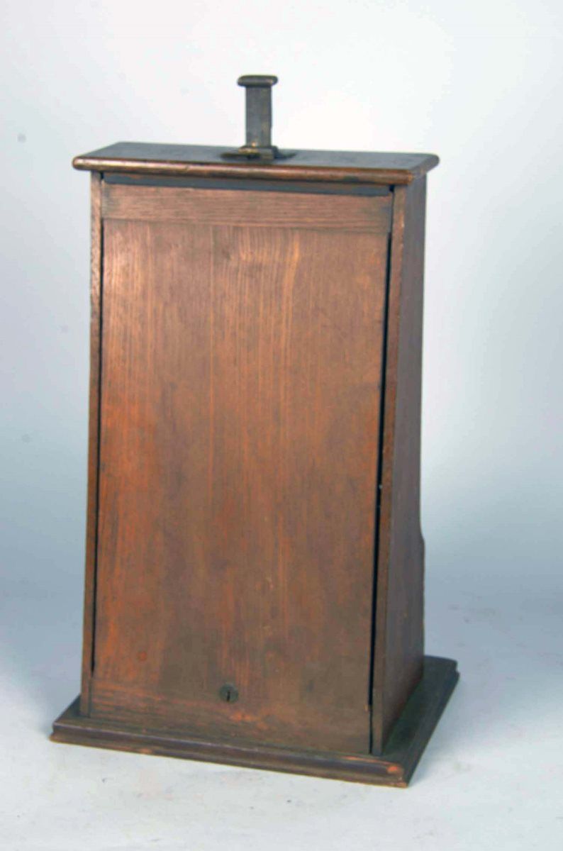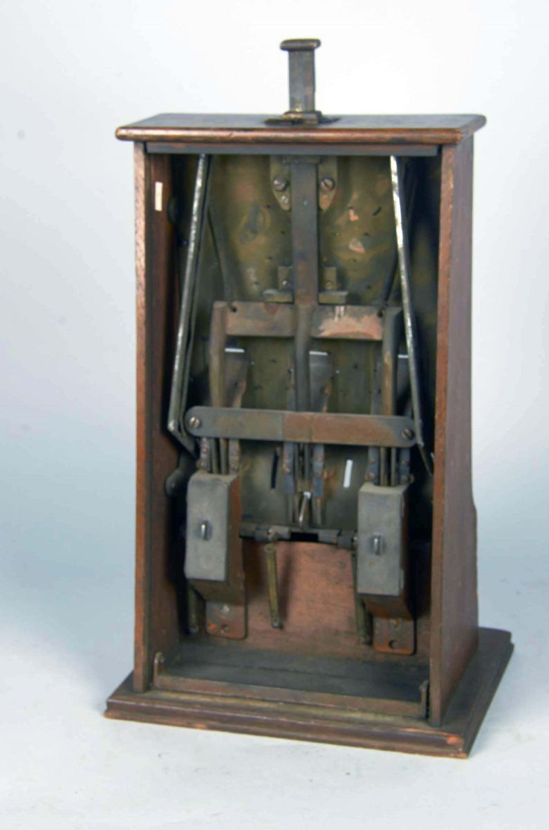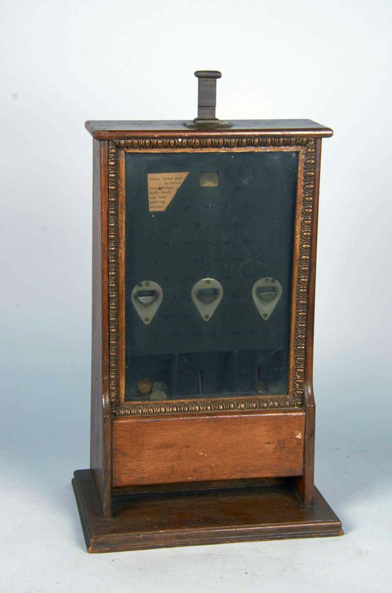 Payout machine features coin drop in fancy wood cabinet with top plunger. Circa 1890s, with key. Condition (Very good). Size 12.5" x 23" x 8.75"