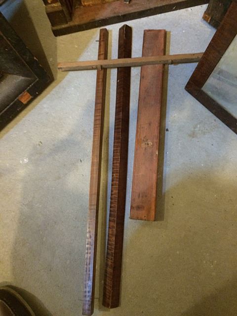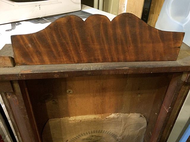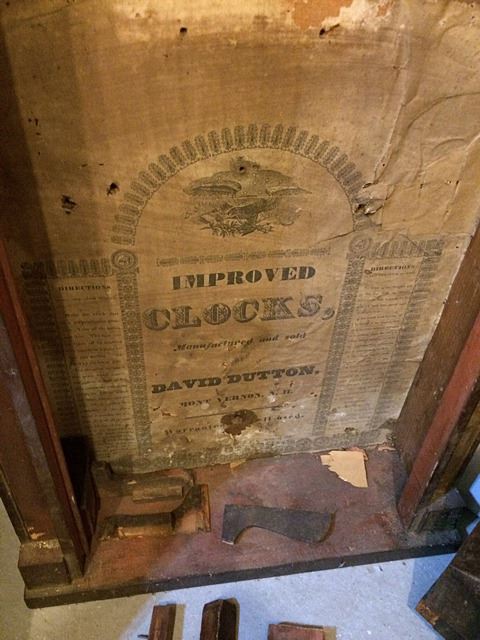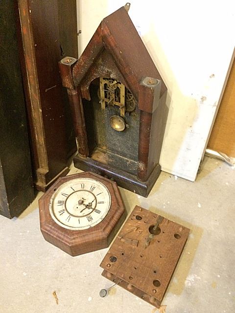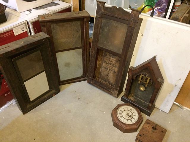 5 Clock Cases and Partial Wooden Works Movement, SethThomas, Thomaston, CT, Charles Stratton, Holden, Mass., 1839, and David Dutton, Mont Vernon, NH tiger maple case. Nice group of clock cases. Steeple clock has partial movement with striking bell, gallery clock case and wooden works.
