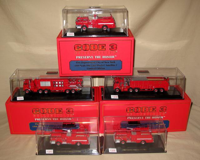 (5) Code 3 1/64th Scale NY City Fire Trucks & Shelf