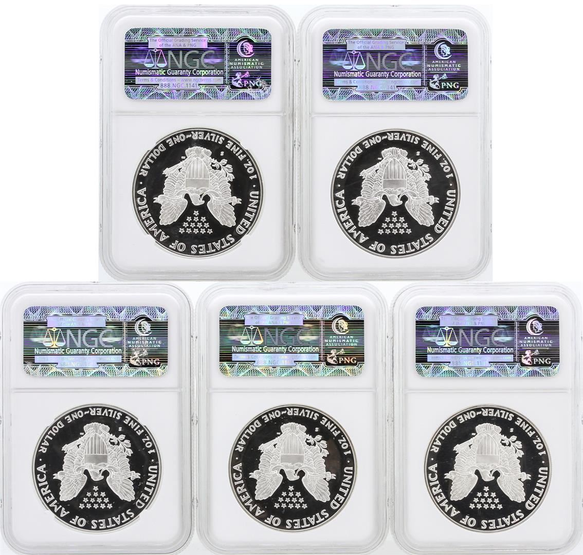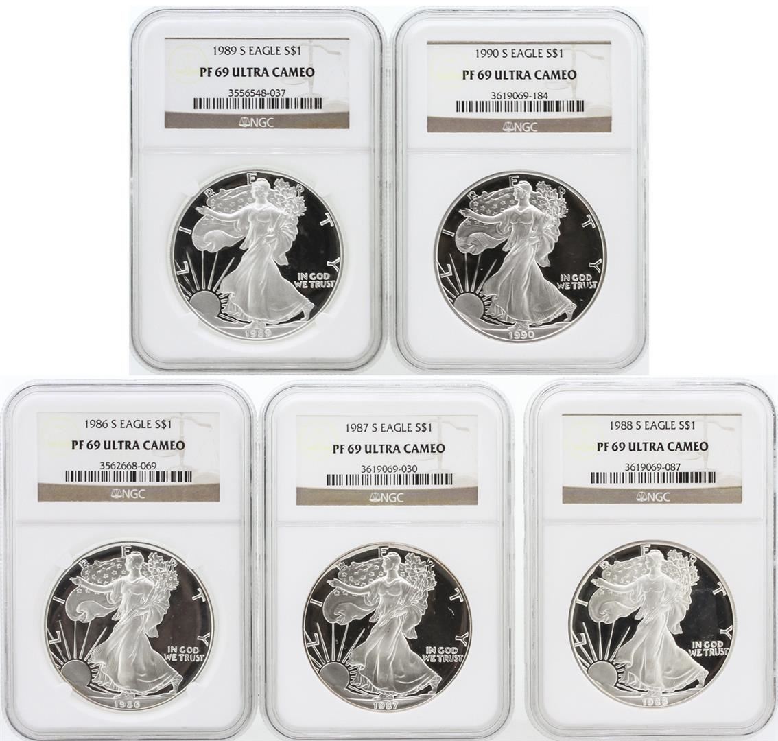 This (5) Coin set includes 1 of each of the following coins: 1986-S Silver Eagle Coin NGC PF 69 Ultra Cameo, 1987-S Silver Eagle Coin NGC PF 69 Ultra Cameo, 1988-S Silver Eagle Coin NGC PF 69 Ultra Cameo, 1989-S Silver Eagle Coin NGC PF 69 Ultra Cameo, and a 1990-S Silver Eagle Coin NGC PF 69 Ultra Cameo. This would make a great start or addition to any collection of U.S. coins. NGC Certified.