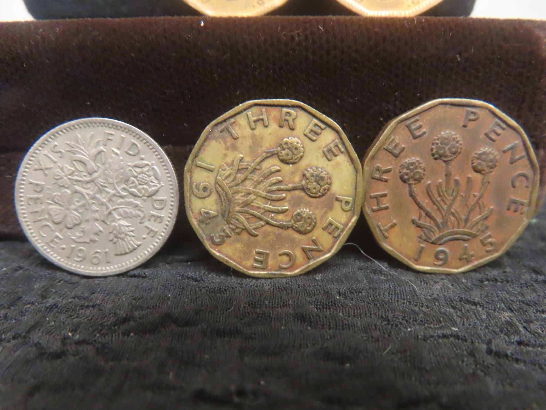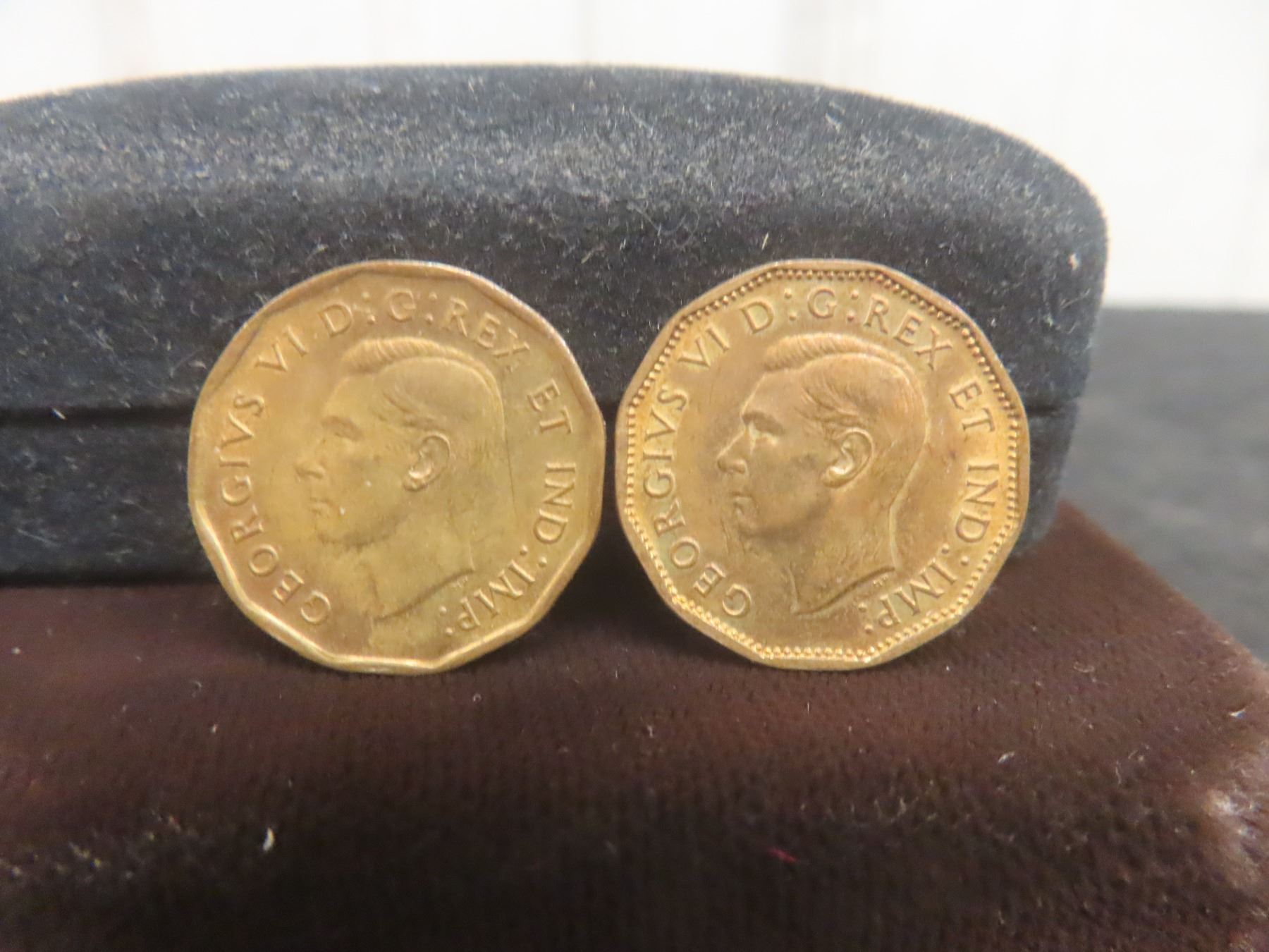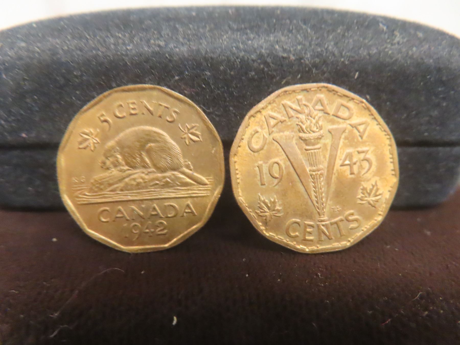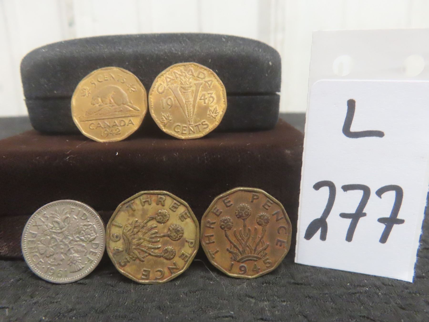 5 Coins — 2 Canadian Tombac 5¢ (1942 & 1943) and 3 British Coins