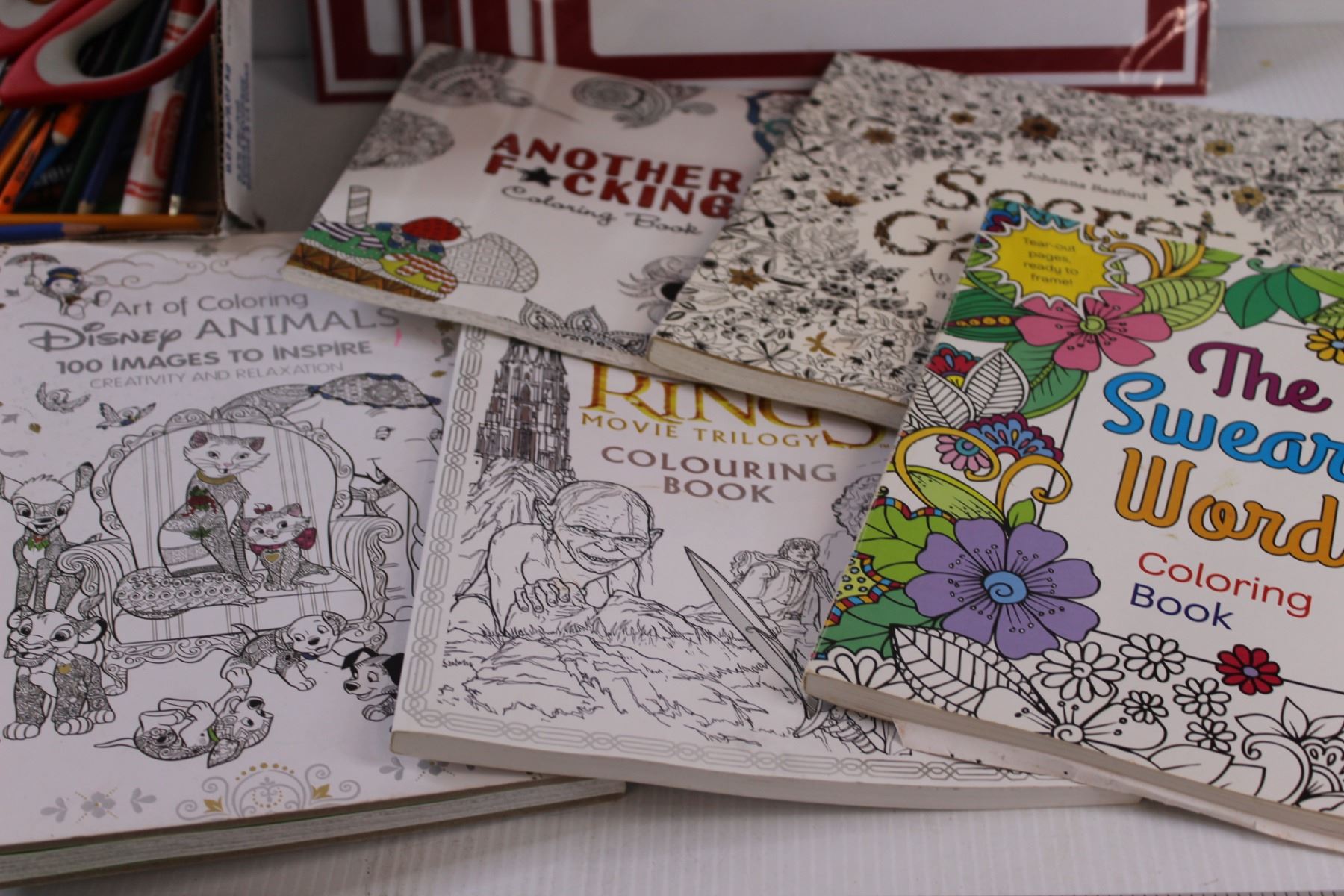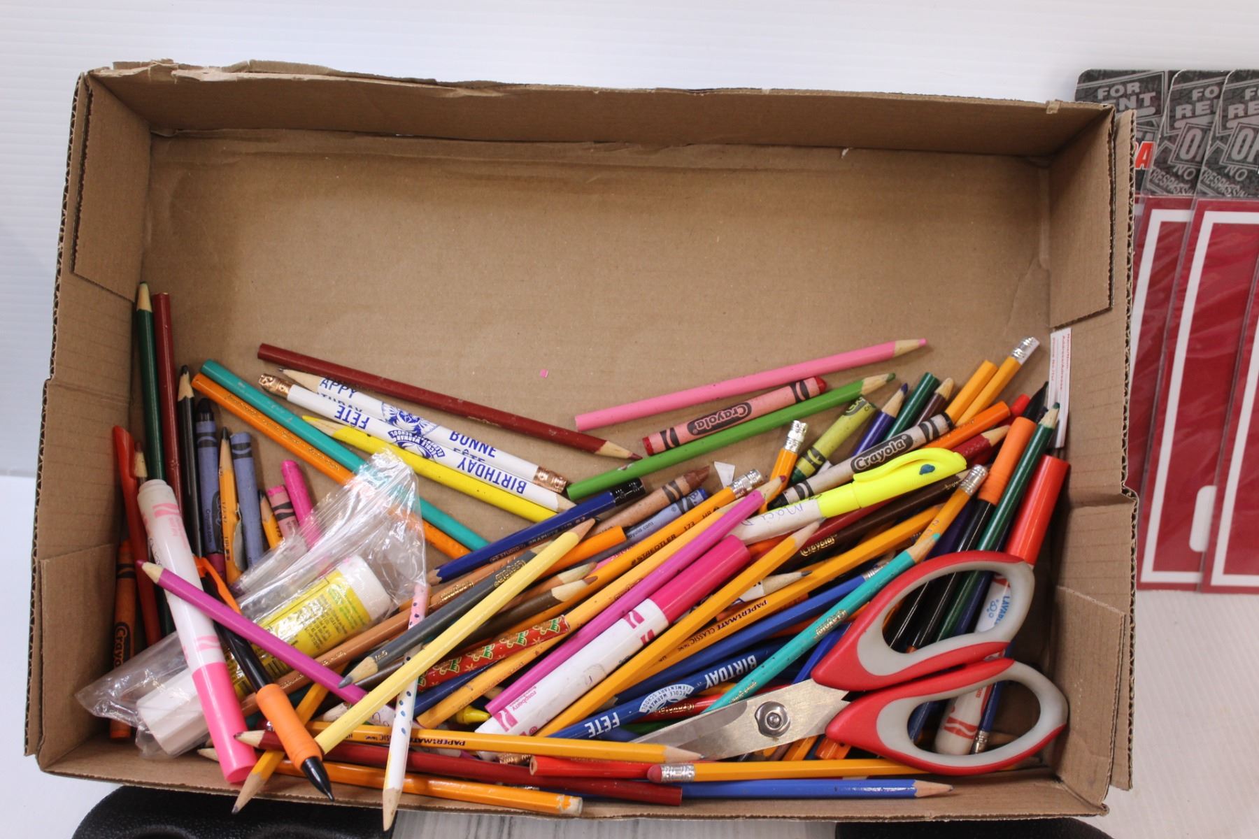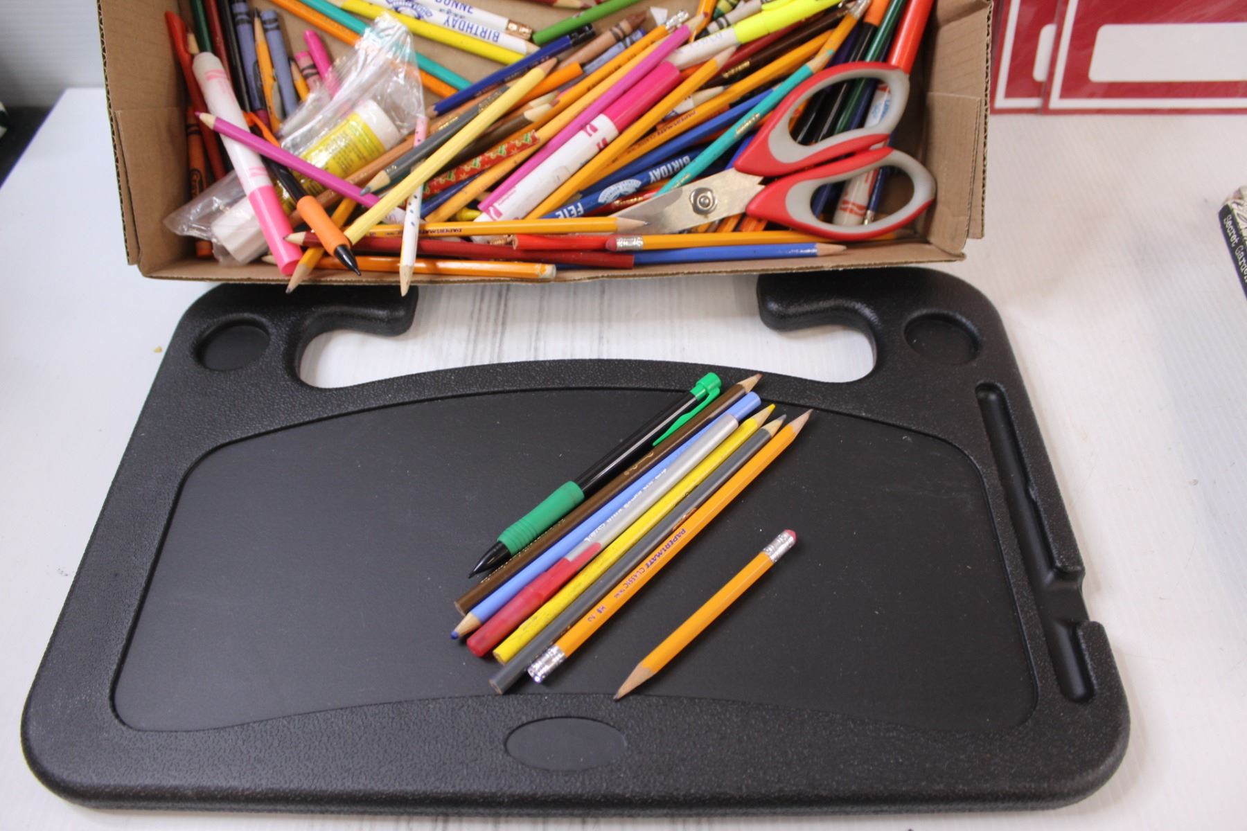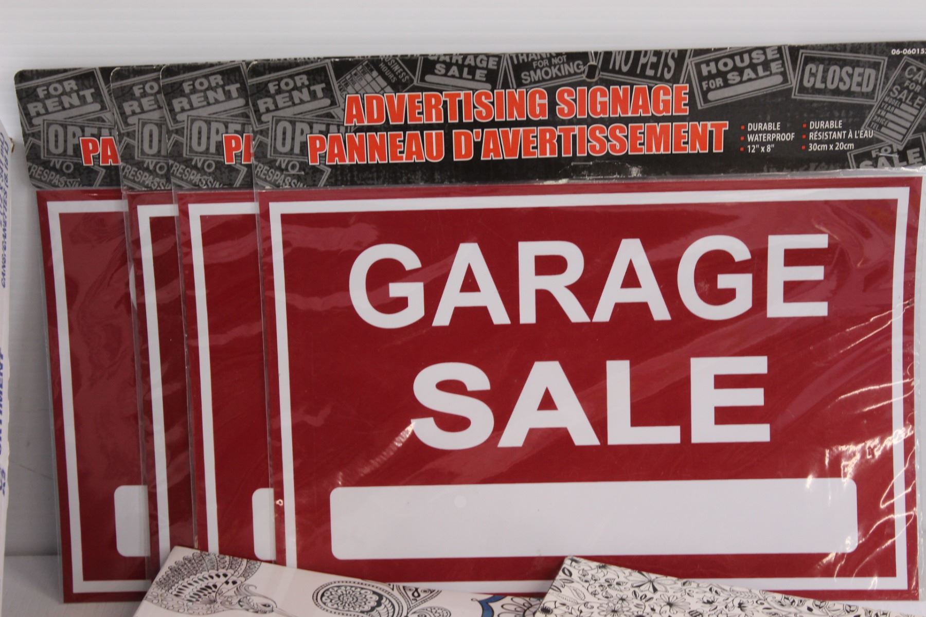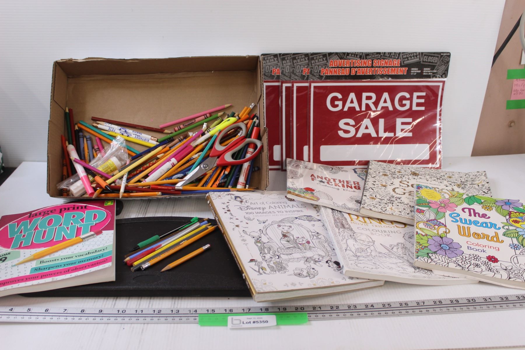 (5) Coloring Books, Word Hunt, (4) Garage Sale Signs, Coloring Lap Tray & Assorted Stationary Items