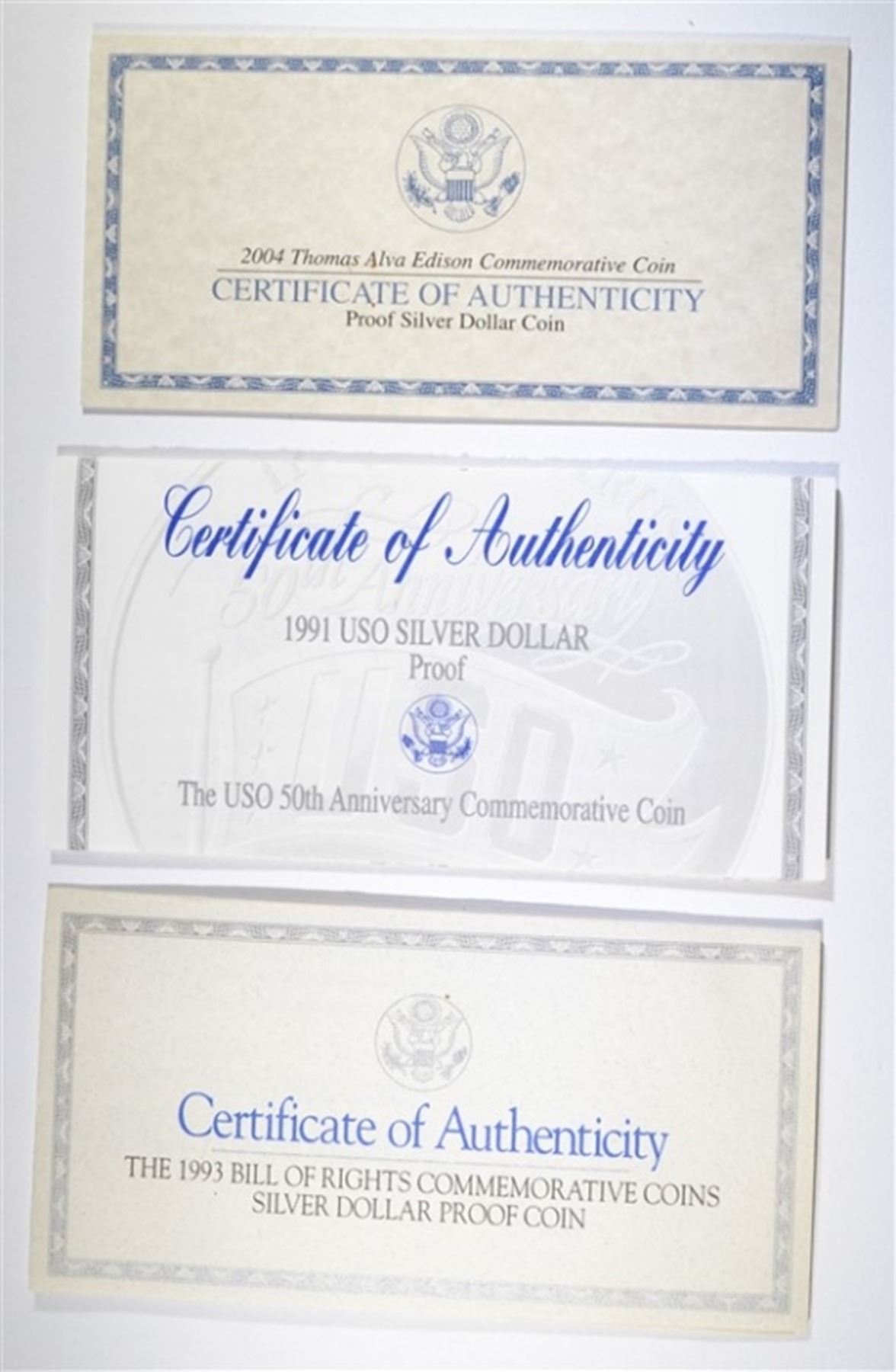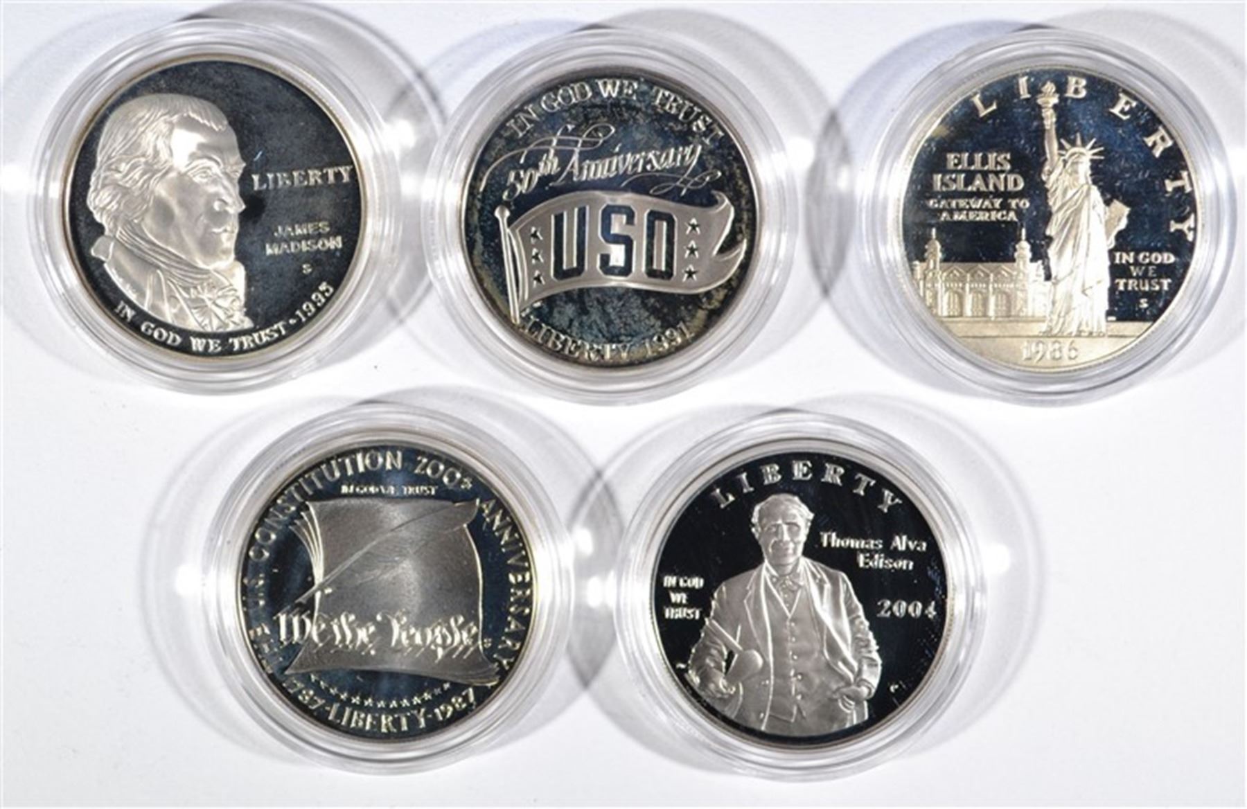 5 Commemorative Sets - 1986-S Liberty Proof Silver Dollar, 2004-P Thomas Edison Proof Silver Dollar, 1991-S USO Proof Silver Dollar, 1987-S Constitution Proof Silver Dollar, 1993-S Bill of Rights Proof Silver