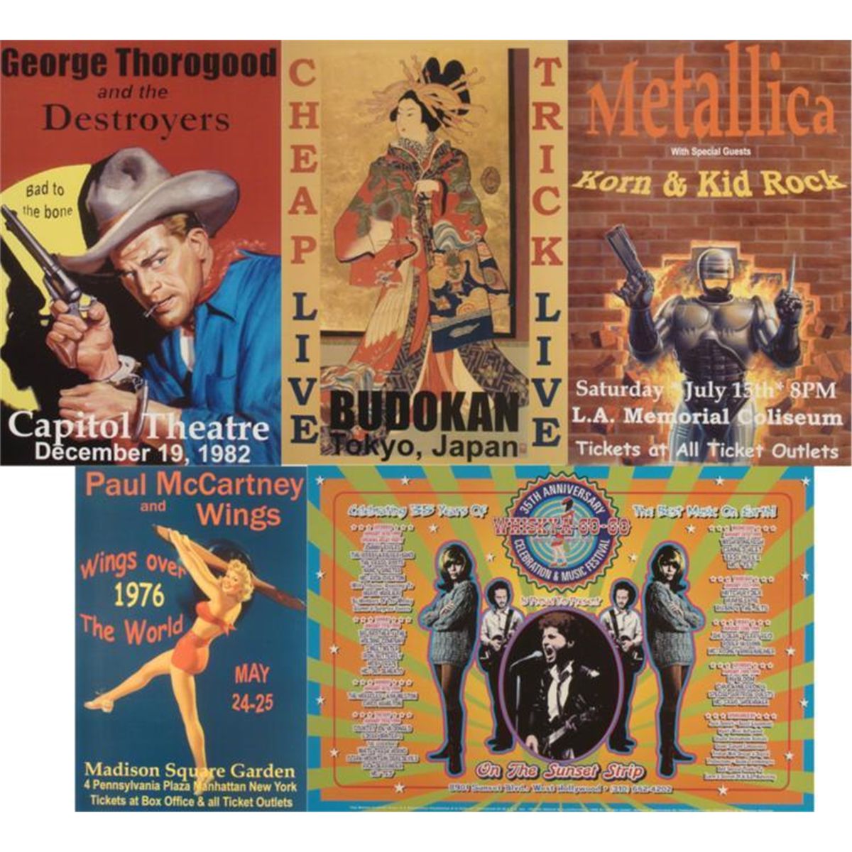 These are 5 reproductions of original concert posters from some amazing musical acts. * * Size: 12" x 18" 4 postersSize: 13" x 19 1/2" 1 posterMedium: Heavy Poster Stock Condition: Excellent The artists include: George Thorogood and the Destroyers "Bad to the bone" (Capitol Theatre, Dec. 19, 1982)Cheap Trick (Budokan, Tokyo, Japan)Metallica w/ Korn & Kid Rock (L.A. Memorial Coliseum, July 15th)Paul McCartney and Wings (Madison Square Garden, May 24-25)Whiskey-A-Go-Go Festival (On the Sunset Strip, West Hollywood)Note: This is a vintage print, not an originalNote: This is a vintage print, not an original