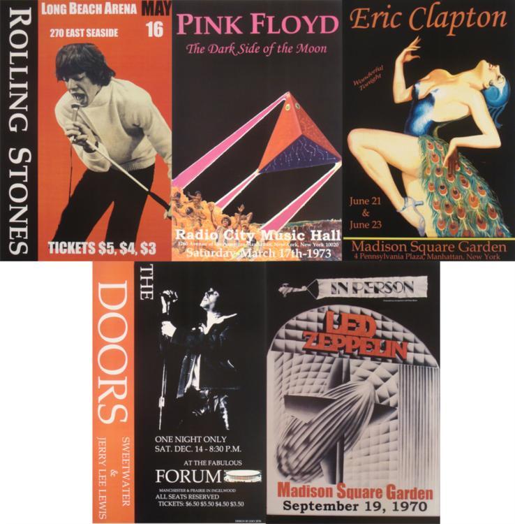 These are 5 reproductions of original concert posters from some rock legends. * * Size: 12" x 18" Medium: Heavy Poster Stock Condition: Excellent The artists include: Led Zeppelin (Madison Square Garden, Sept 19th, 1970) Pink Floyd "The Dark Side of the Moon" (Radio City Music Hall, March 17th 1973) Eric Clapton (Madison Square Garden, New York) The Doors Sweetwater & Jerry Lee Lewis (Forum, Dec 14th) Rolling Stones (Long Beach Arena, May 16th)