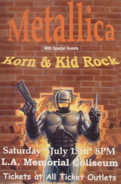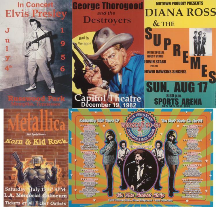 These are 5 reproductions of original concert posters from some impressive musical acts. * * Size: 12" x 18" Medium: Heavy Poster Stock Condition: Excellent The artists include: Metallica w/ Korn & Kid Rock (L.A. Memorial Coliseum, July 15th) George Thorogood and the Destroyers "Bad to the bone" (Capitol Theatre, Dec. 19, 1982) Diana Ross & the Supremes (Sports Arena, Aug. 17th) Elvis Presley (Russwood Park Memphis Tennessee, July 4th 1956) Whiskey-A-Go-Go Festival (On the Sunset Strip, West Hollywood)