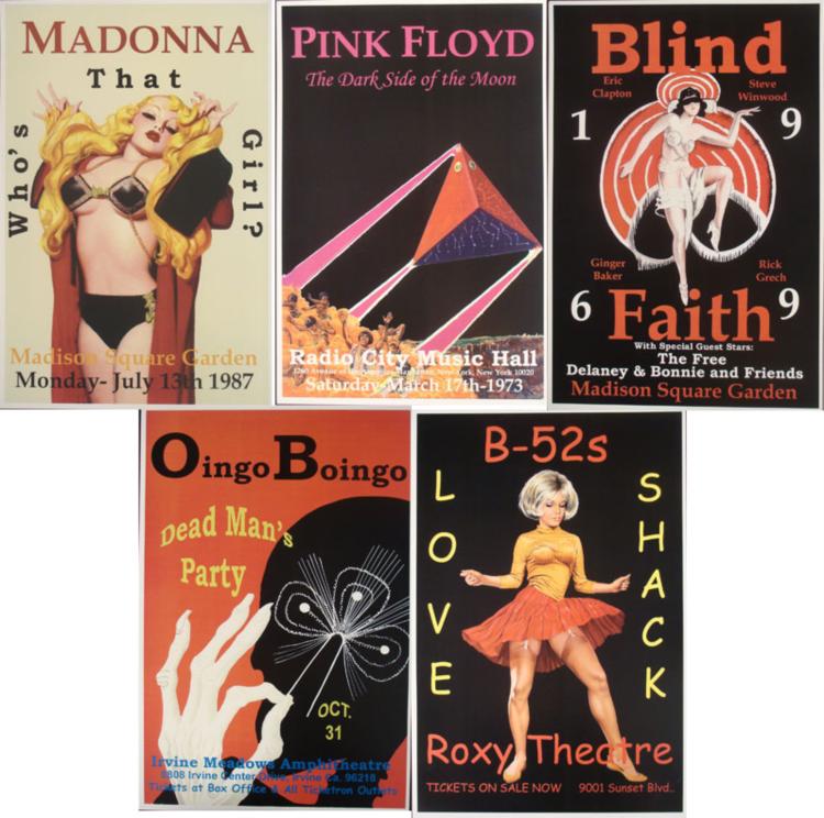 These 5 reproductions of original concert posters are from some of music's most influential artists. * * Size: 12" x 18" Medium: Heavy Poster Stock Condition: Excellent The artists include: Blind Faith Eric Clapton/Steve Winwood/Ginger Baker/Rick Grech (Madison Square Garden) Pink Floyd "The Dark Side of the Moon" (Radio City Music Hall, New York, March 17-1973) Madonna "Who's That Girl" (Madison Square Gardan, July 13th 1987) Oingo Boingo "Dead Man's Party" (Irvine Meadows Amphitheatre, Oct. 31) B-52's "Love Shack" (Roxy Theatre, Sunset Blvd.)