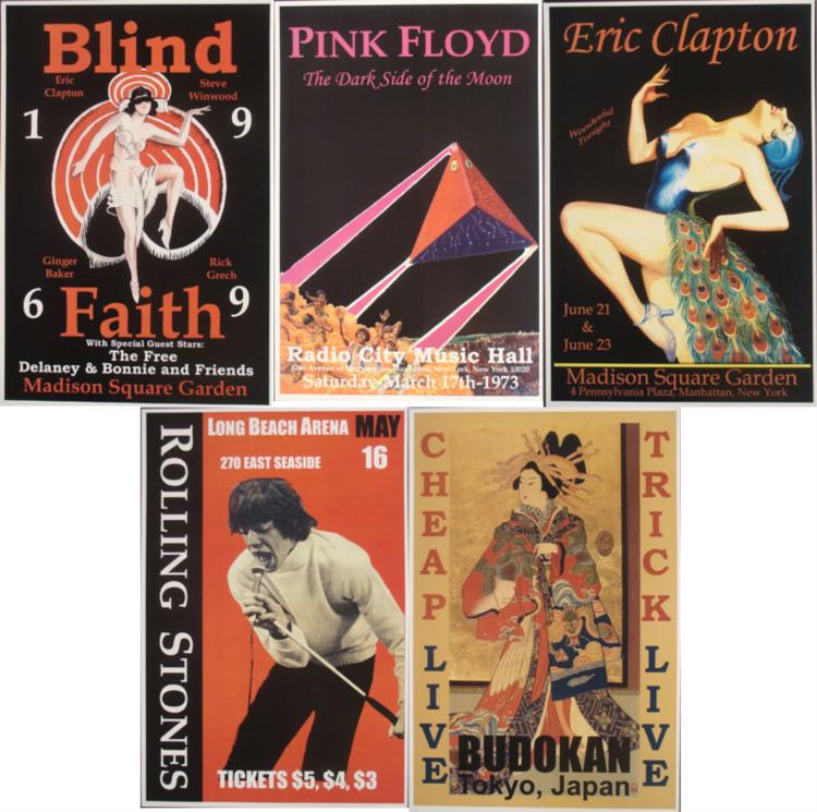 Here are 5 reproductions of original concert posters from some heavy, hard rocking bands. * * Size: 12" x 18" Medium: Heavy Poster Stock Condition: Excellent The artists include: Rolling Stones (Long Beach Arena, May 16th) Eric Clapton (Madison Square Garden, New York) Blind Faith Eric Clapton/Steve Winwood/Ginger Baker/Rick Grech (Madison Square Garden) Cheap Trick (Budokan, Tokyo, Japan) Pink Floyd "The Dark Side of the Moon" (Radio City Music Hall, New York, March 17-1973)