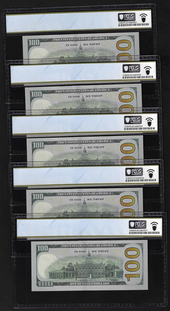 One (5) Consec. 2017A $100 Federal Reserve Bank Notes PCGS Gem Unc. 65PPQ Fancy Serial. PCGS Graded.