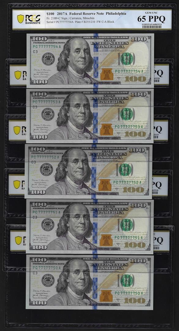 (5) Consec. 2017A $100 Federal Reserve Bank Notes PCGS Gem Unc. 65PPQ Fancy Serial