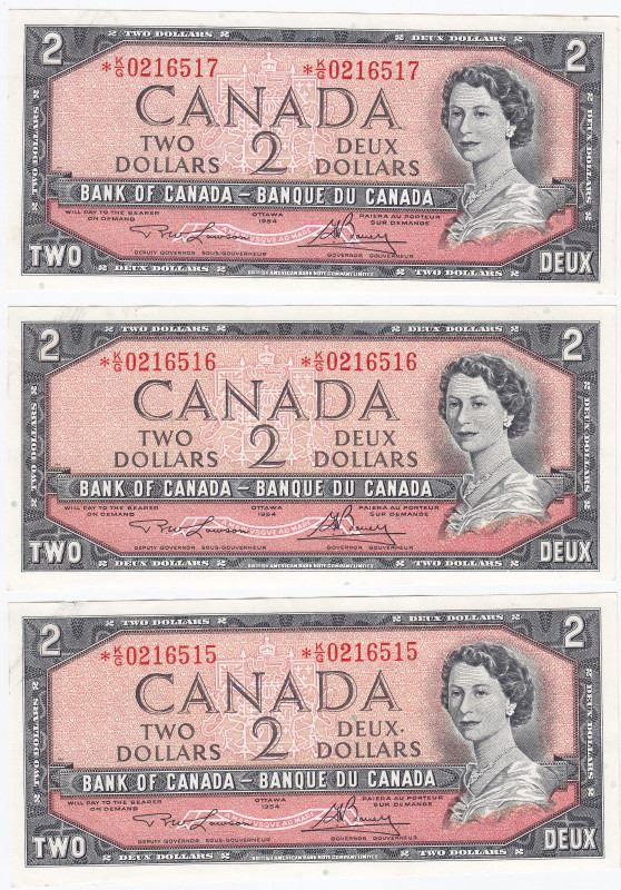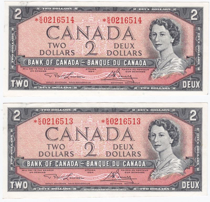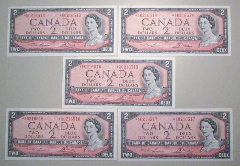 5 Consecutive 1954 Bank Of Canada $2 Replacement Notes - Modified Portrait - EF+/AU+ - BC-38da - Trends Value $300