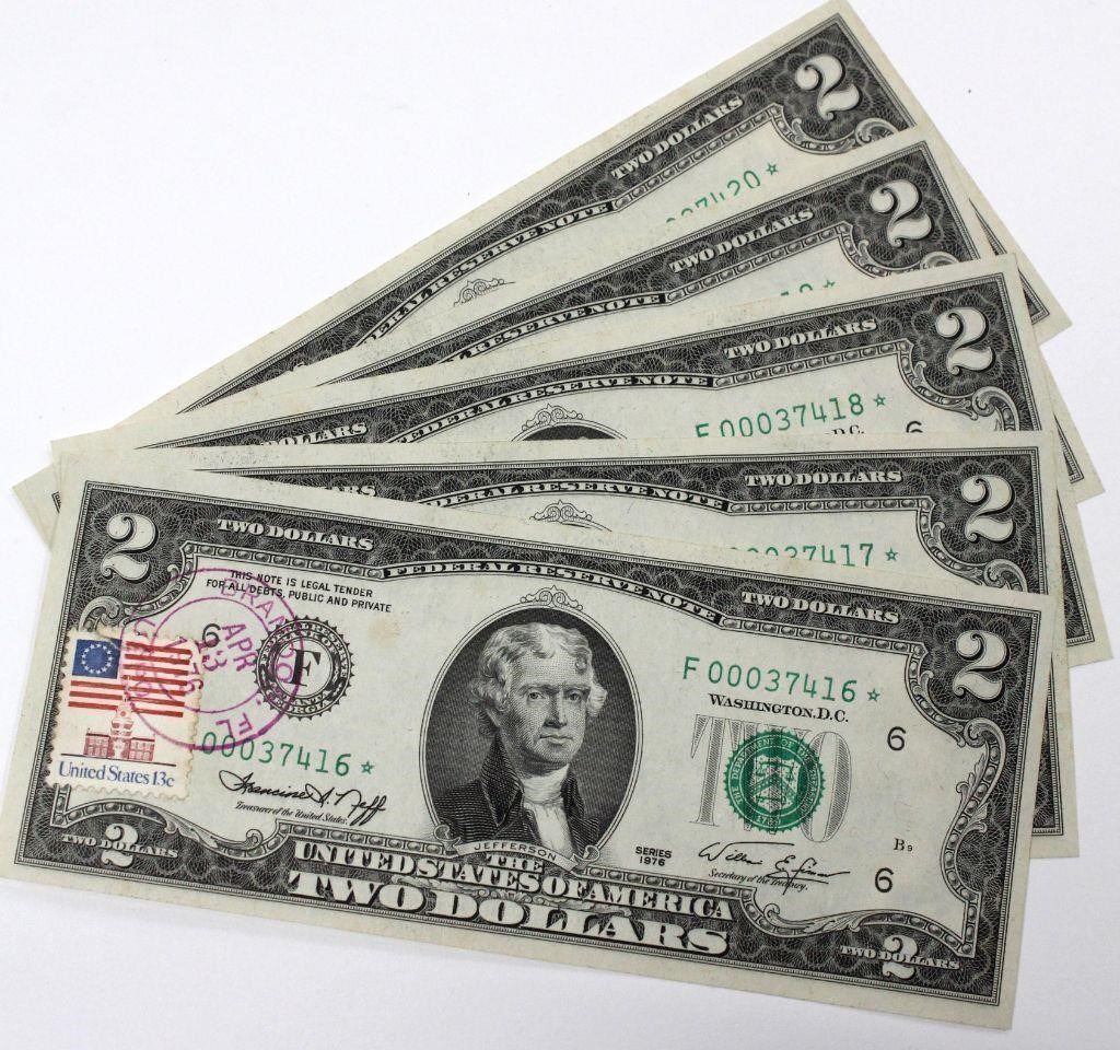A group of five (5ct.) Consecutive First Day of Issue, Bicentennial $2 Star Notes, in gem uncirculated with flag over Independence Hall stamps. A great collectible.