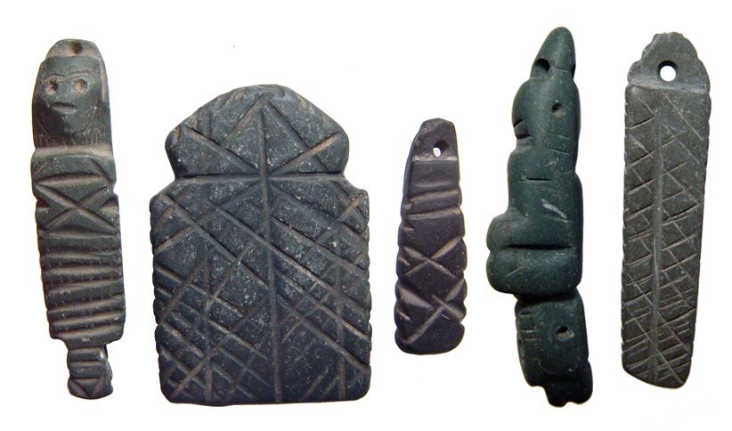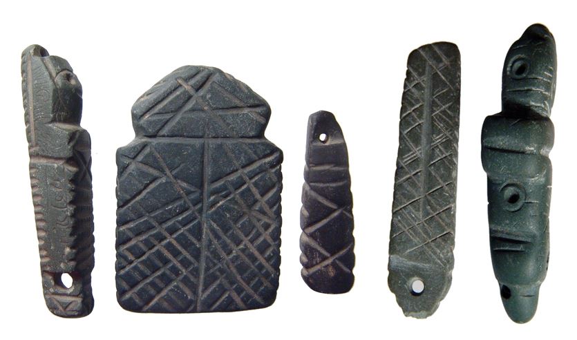 A lot of 5 Coptic steatite amulets, c. 5th– 7th Century AD, including a late derivative of the double-plume type, a stylized animal, with intricately incised lines and drilled circles, a herm-type amulet with human head, (L: 2 ¼ in, 5.7 cm), a palette, divided into two with triangular top, (2 in x 1 3/8 in, 5 x 2.4 cm), and a pendant with incised lines, (L: 1 5/8 in, 4.1 cm). Each is intact and decorated with incised lines, four drilled for suspension. Ex Negus Collection, UK, acquired in the early 20th Century.