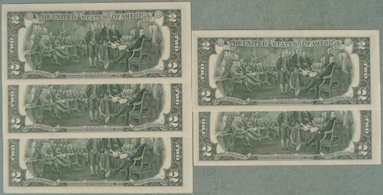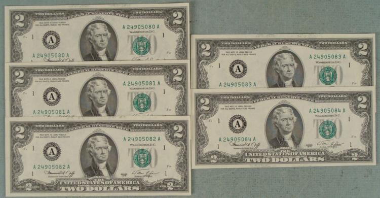 (5) 1976 $2 bills with sequential serial numbers * Mint mark: A (Boston) Grade: Crisp Uncirculated