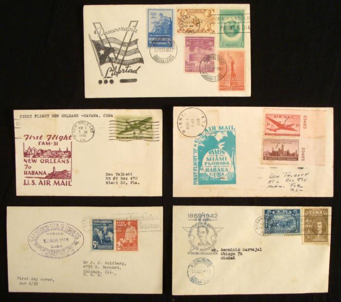 Here are 5 covers from Cuba dating from the 1930's to the 1940's, all with cachets. Included are two First Flights to Havana, and the others are from Cuba, with Cuban stamps. They are in good to very good condition, some with slight smudging.