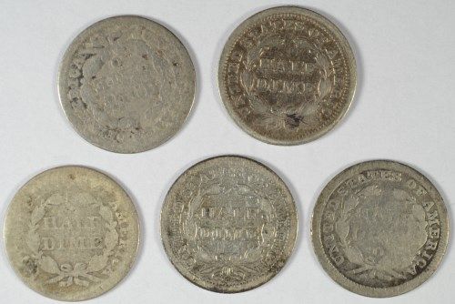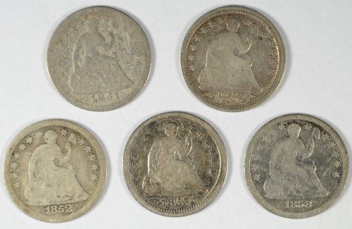 5 DIFFERENT SEATED HALF DIMES (51-O, 52, 53, 54, 58-O) GOOD