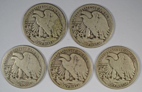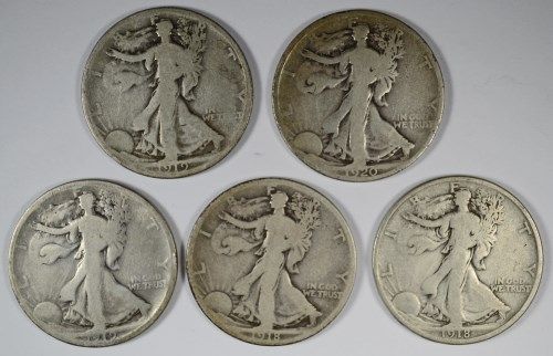 5 DIFFERENT WALKING LIBERTY HALF DOLLARS (18-D,18-S,19-D,19-S,20) G/VG