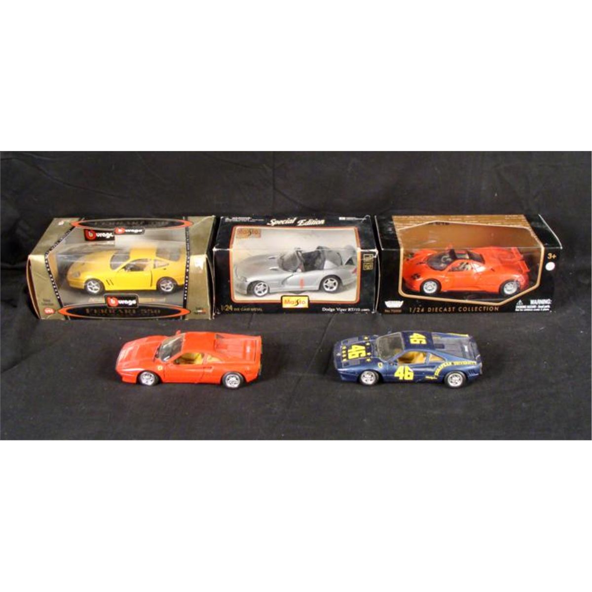 Offered are five die cast cars from Motor Max, Revell, and Masito and there sizes are 1/24. In this lot you will receive: * (2) Ferrari 288 GTO * 1996 Ferrari F550 * 1997 Dodge Viper RT/10 * Pagani Zonda Z12 * Four of the six die cast cars come in their original box. The blue Ferrari 288 GTO is missing a windshield. There conditions range from good to excellent (this includes the box conditions).