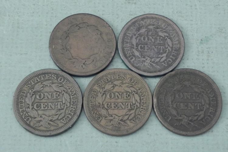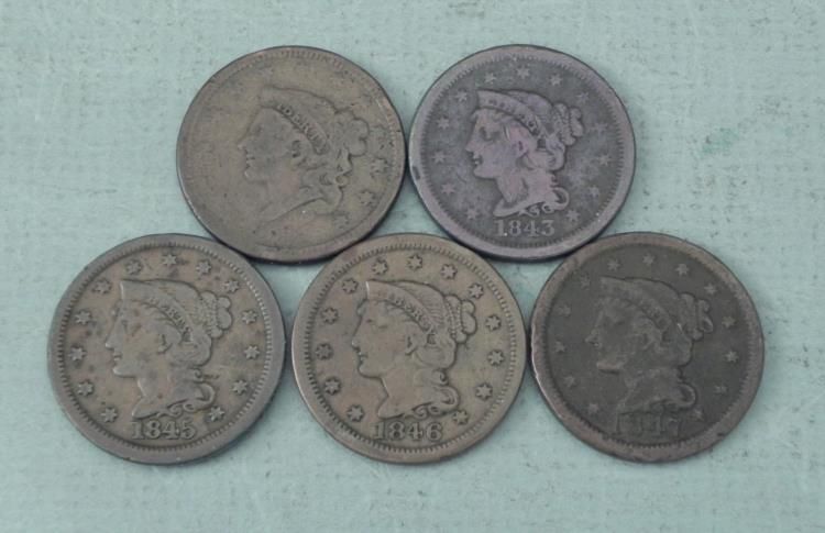 5 Different Date Large Cents * Type: Coronet Head Dates: 1838 1843 -mature head1845 -high grade, good detail1846 - small date, high grade1847 -braided hair