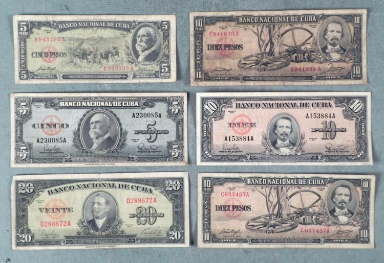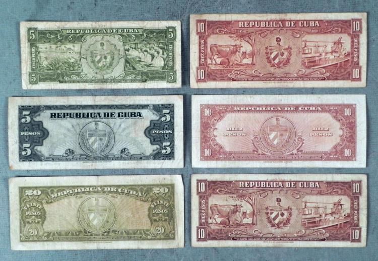 5 Diff Old Cuban Currency 1949-1960 * (2) 5 Pesos(3) 10 Pesos(1) 20 Pesos *