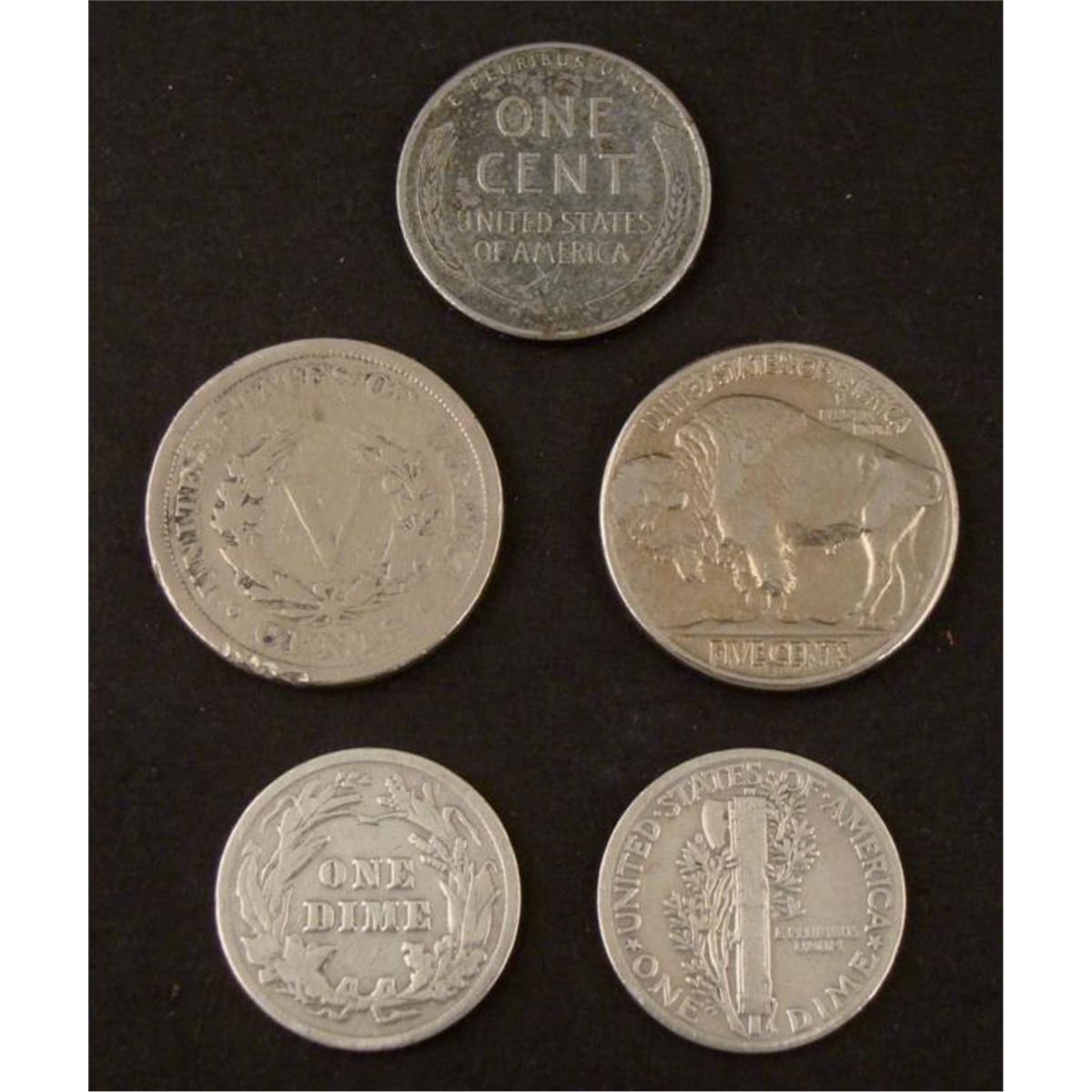 5 Diff Type 1900s US Coins Penny, Nickel, Dime