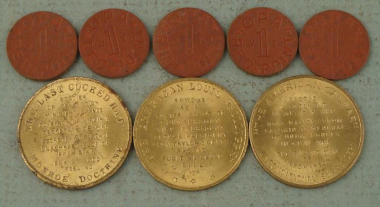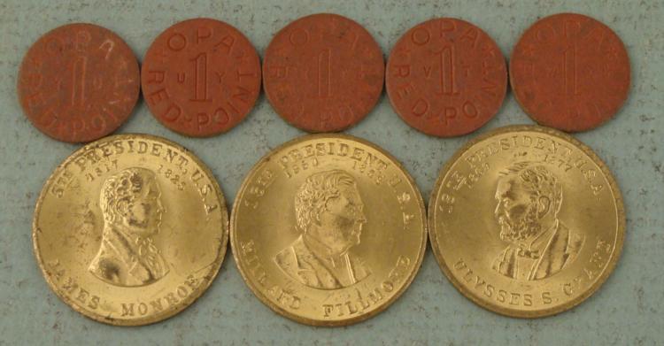 5 Different WWII era OPA Red Point Tokens & 3 Presidential Medals