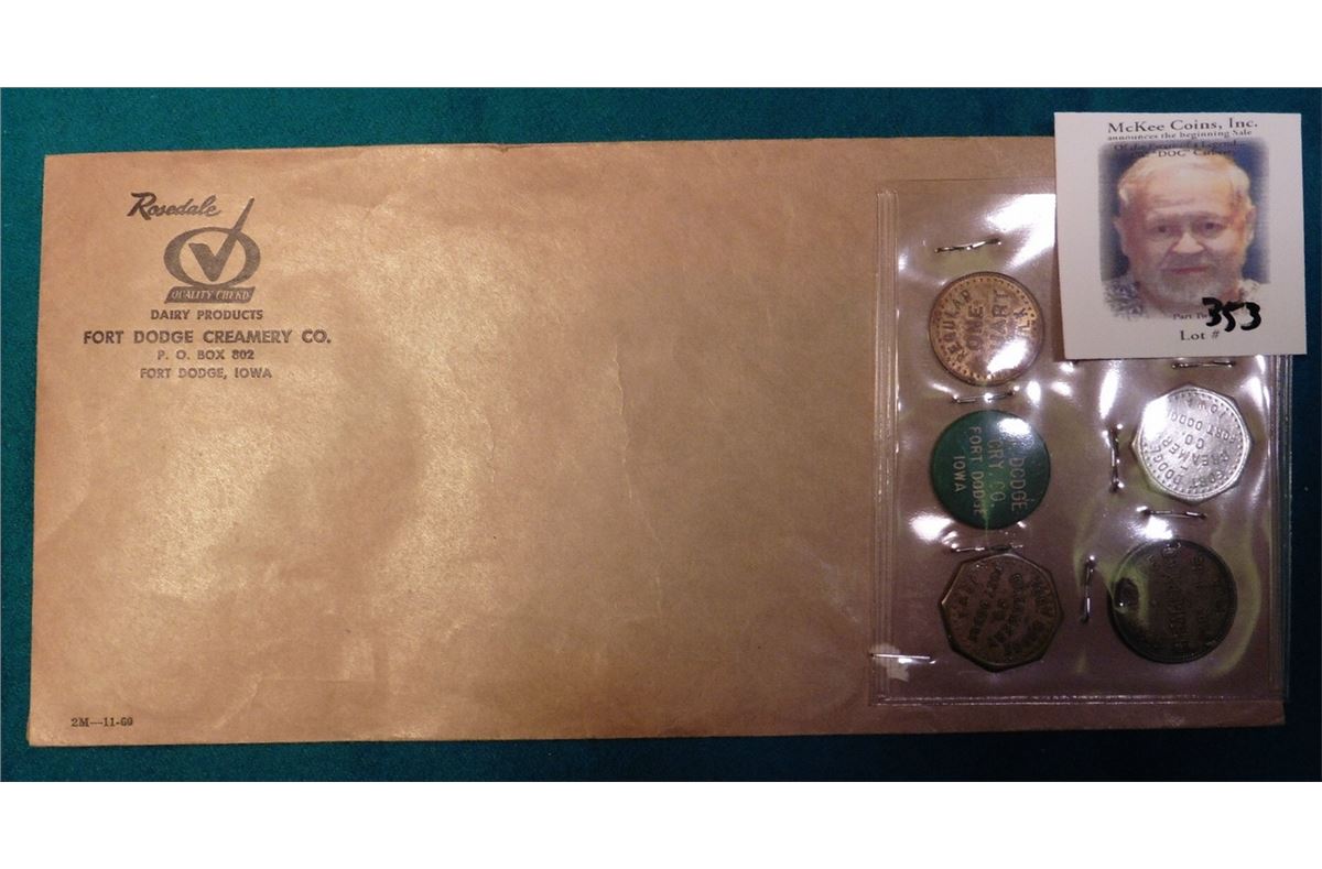 (5) Different “Fort Dodge Creamery” Fort Dodge, Iowa Good For Tokens. (3) “Quart of Milk”, “One Pint”, & “Homo Half Gallon Milk” & a business envelope with letter head from the creamery.