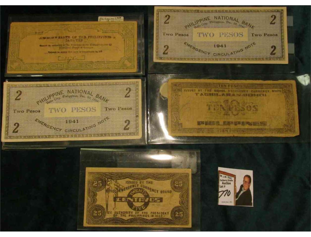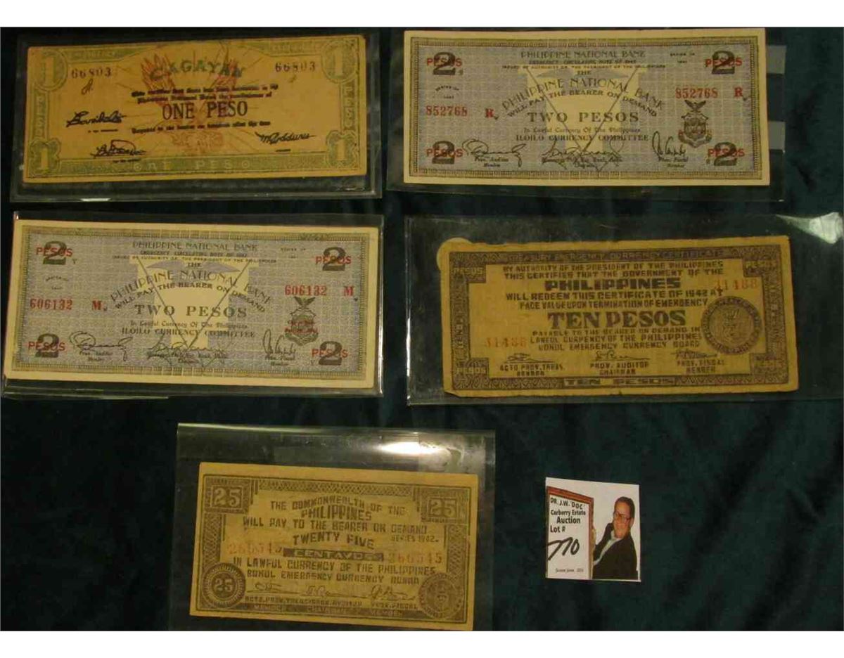 (5) Different Guerilla Banknotes from World War II Philippines Islands.