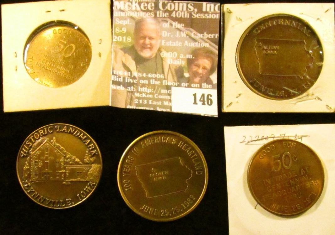 (5) Different Iowa Centennial Medals, all brass. Includes Alton, Pocahontas, Lynnville, Plover, & Marcus, Iowa.