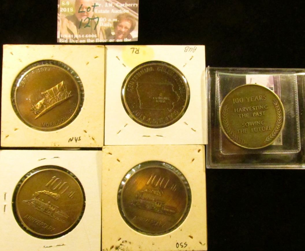 (5) Different Iowa Centennial Medals, all brass. Includes Berkley, Maxwell, Whiting, Conrad, & Morrison, Iowa.