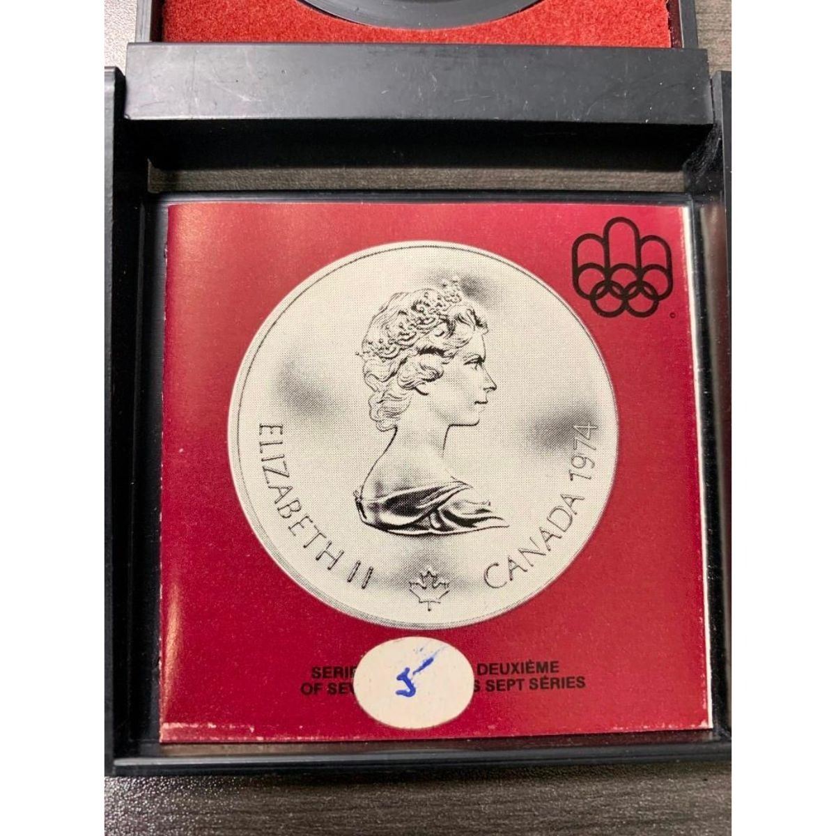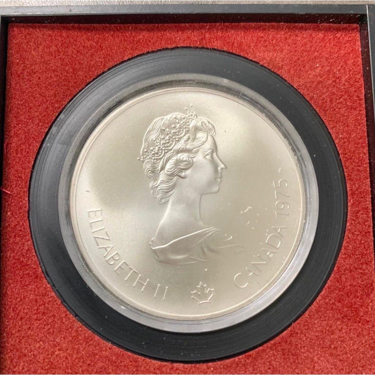 Commemorative issue 1976 Olympics, Montreal Obverse Bust of Elizabeth II to right. Lettering: ELIZABETH II CANADA 1974 Engraver: Arnold Machin Reverse Waves, Olympics logo Lettering: Olympiade XXI Olympiad Montreal 1975 5 Dollars Engraver: Lynda Cooper Specifications Country: Canada Type: Non-circulating coin Year: 1975 Value: 5 Dollars (5 CAD) Currency: Canadian dollar (1858-date) Composition: Silver (.925) Weight: 24.3 g Diameter: 38 mm Thickness: 2.35 mm Shape: Round