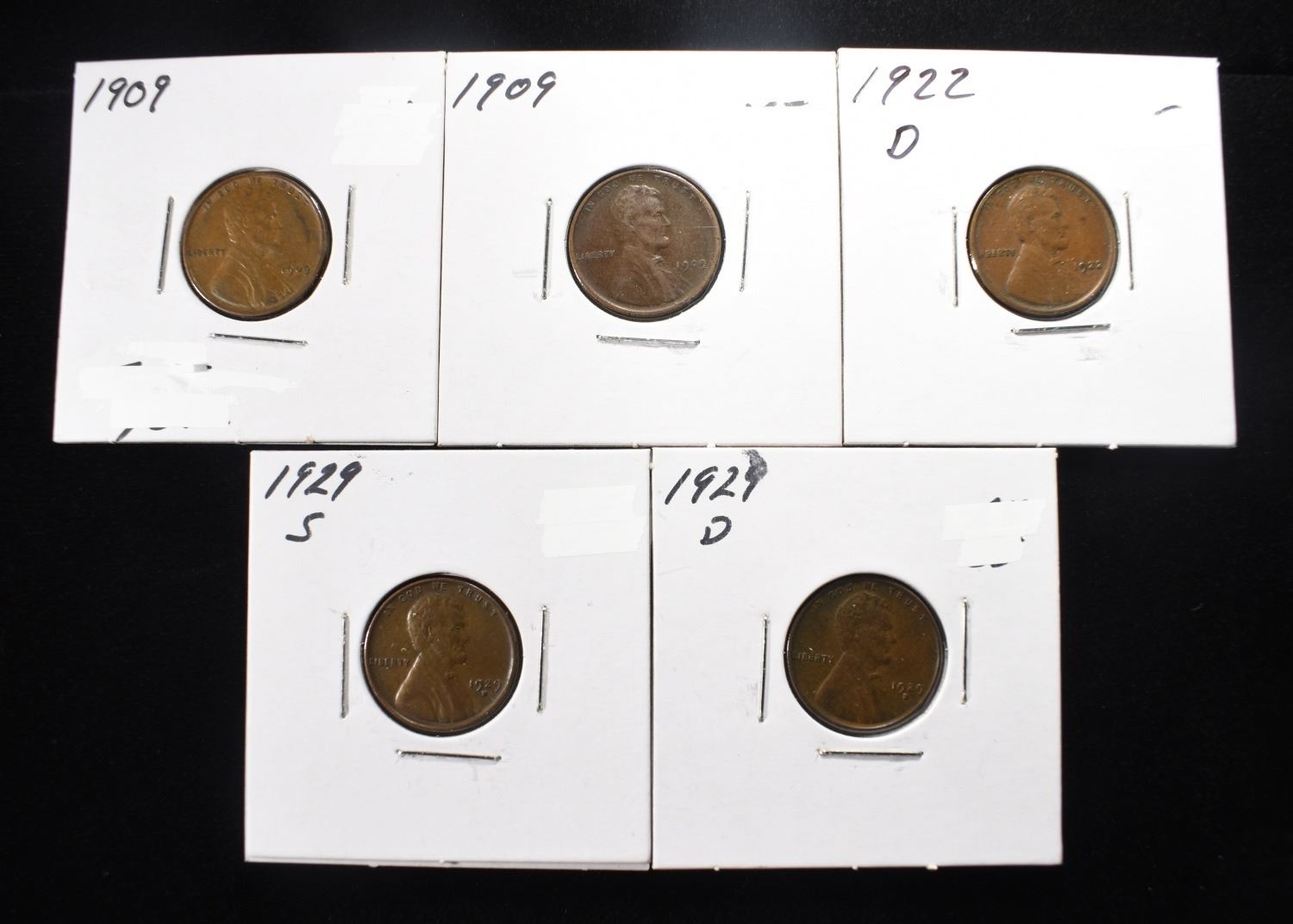 1909 AU/BU, 1922-D VF, 1929-D XF/AU, 1929-D AU/BU, 1909 XF LINCOLN WHEAT CENT ESTIMATE $75 - $100.