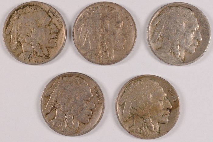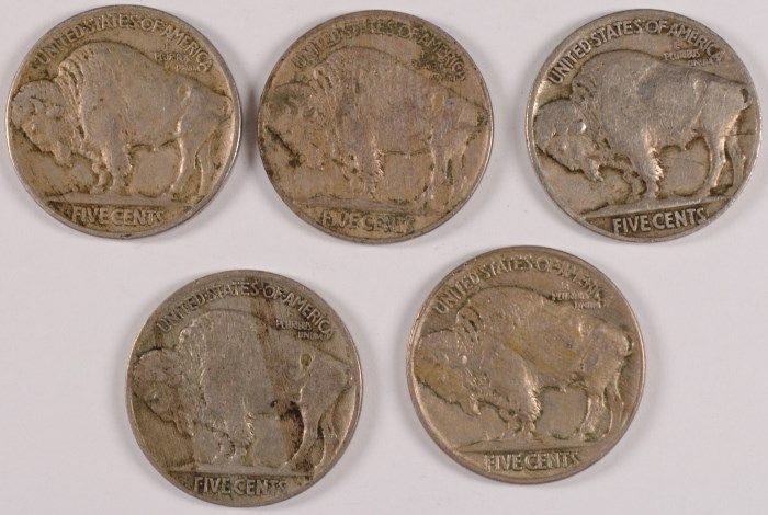 5 EARLY P MINT BUFFALO NICKELS 1913 T2 F, 15 XF, 16 XF, 17 VF, 19 XF