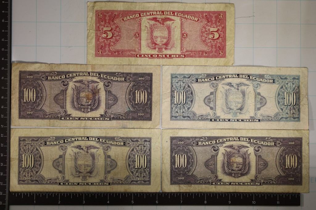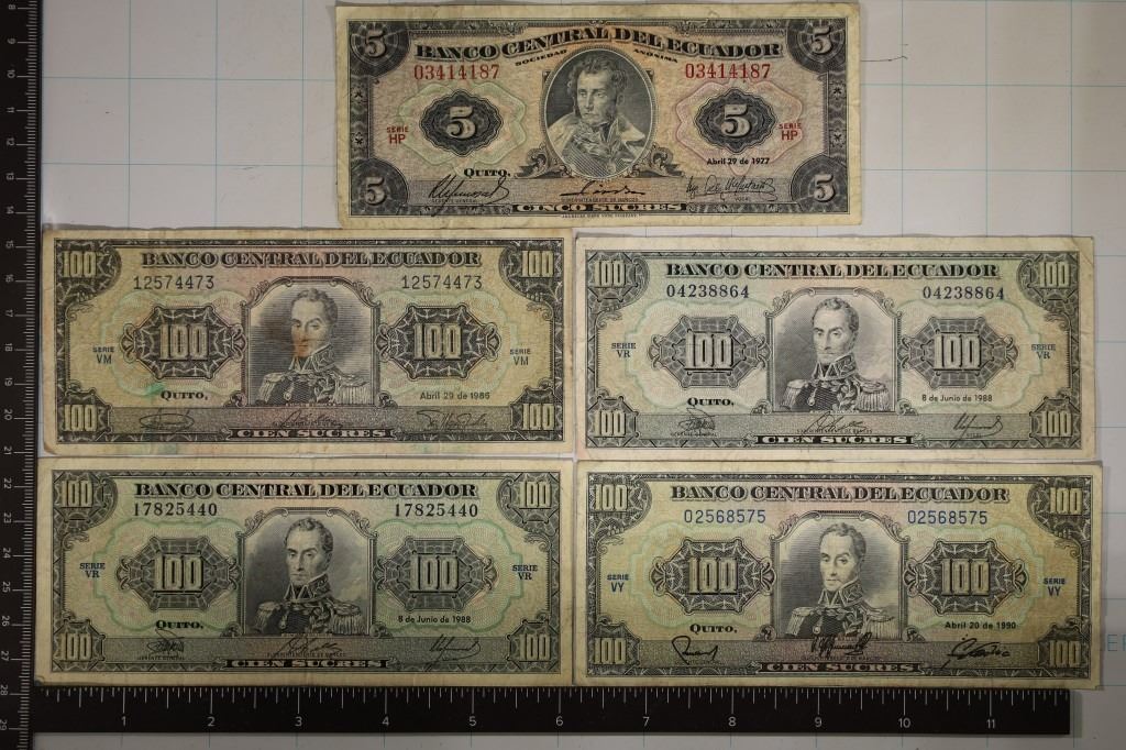 2-1988-100 SUCRES AND 1990-100 SUCRES. THE 1 COLON HAS A STAMP ON THE REVERSE