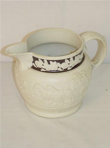 5" ENGLISH SALT GLAZED PITCHER W/ EMBOSSED FOX HUNTING SCENE - MINOR GLAZE IMPERFECTIONS