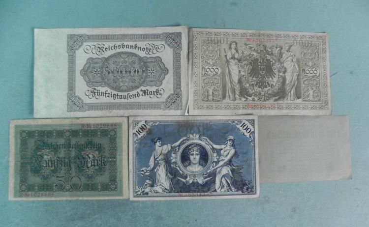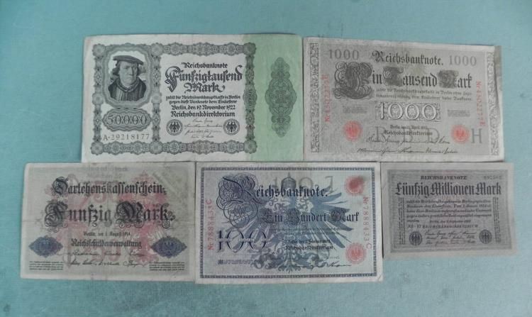 5 Early German notes 1910-192350 Mark - 1914100 Mark - 19081,000 Mark - 191050,000 Mark - 192250,000,000 Mark - 1923