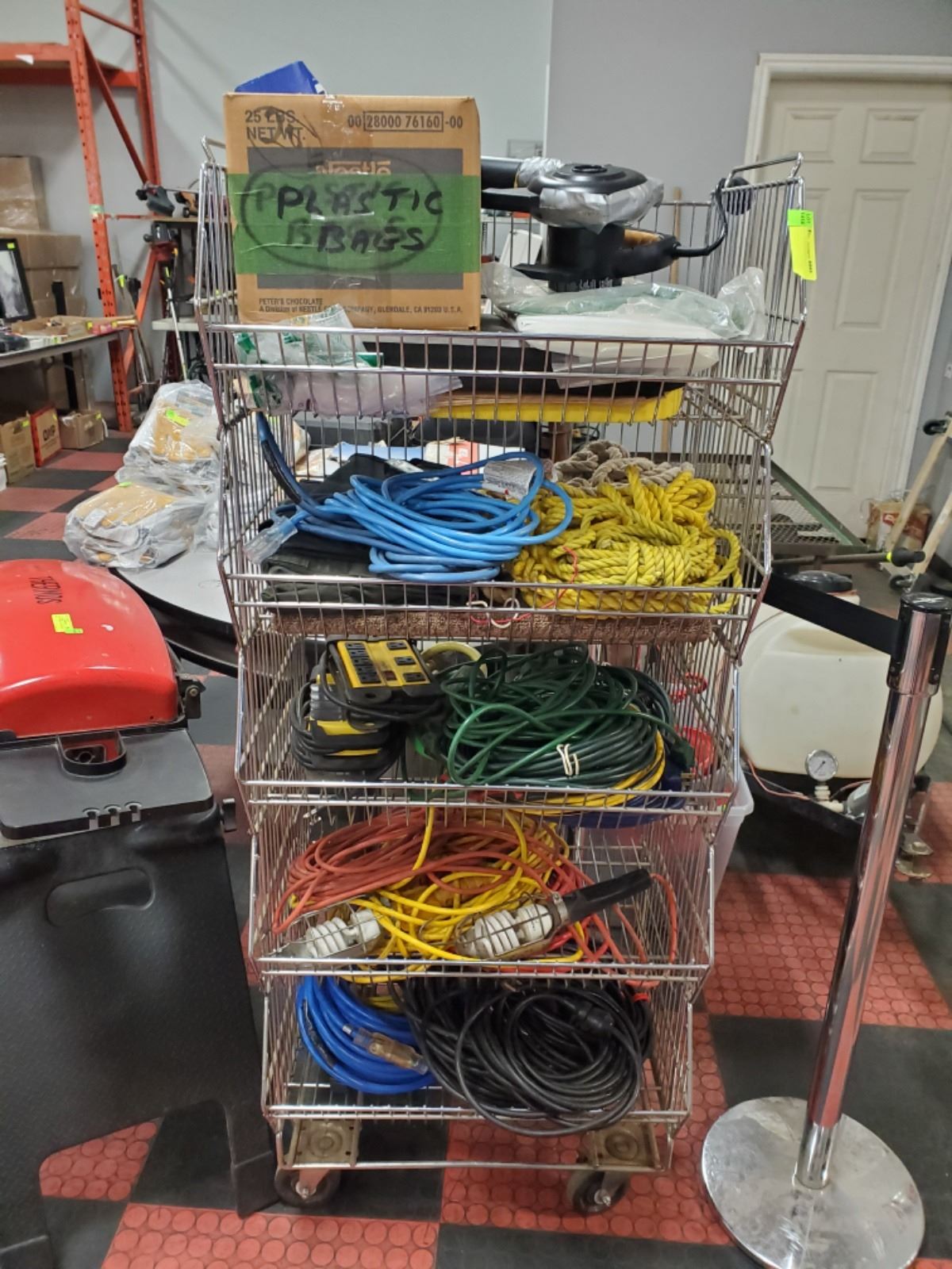 5 FOOT STEEL RACK ON WHEELS WITH CONTENTS