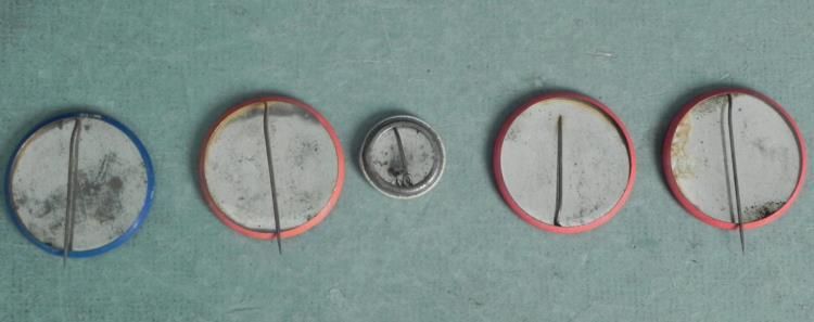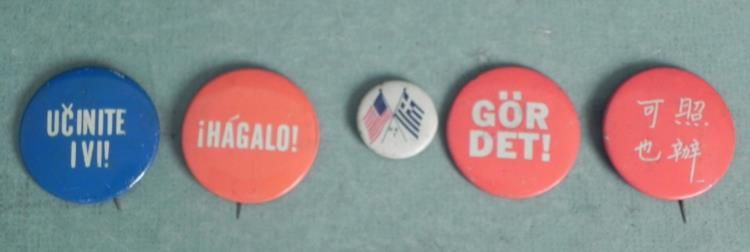 5 FOREIGN BUTTONS-1 WITH SCANDINAVIAN FLAG-ASIAN, SPANISH 1 3/4" AND 1"