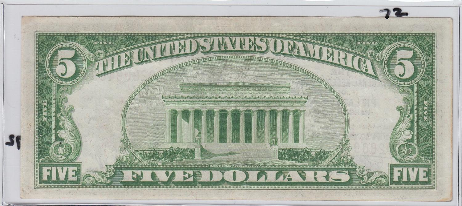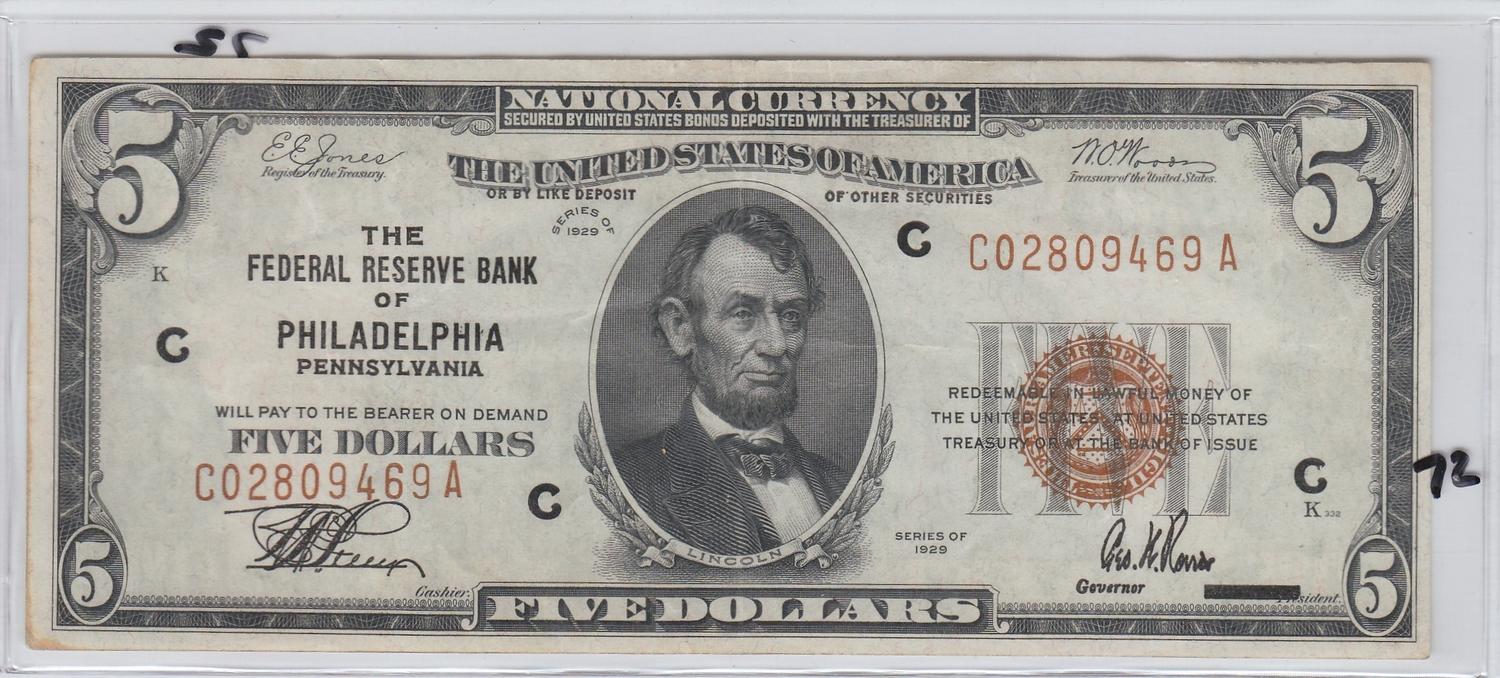 $5 FRBN BROWN SEAL 1929 PHILADELPHIA NATIONAL CURRENCY