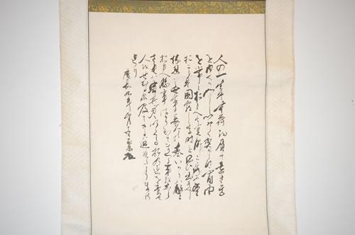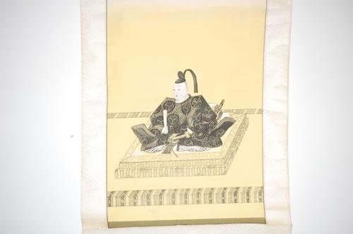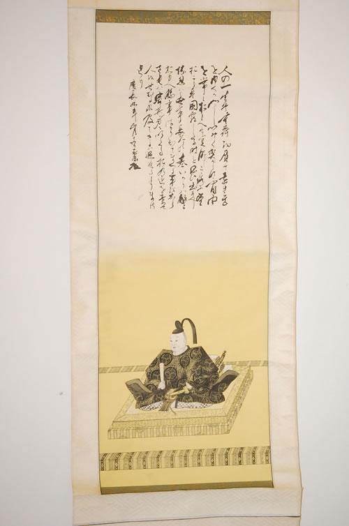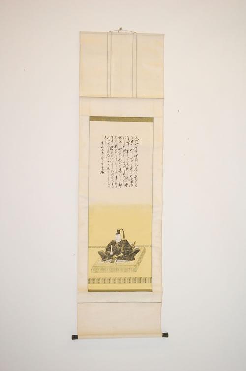 5 FT. 4" JAPANESE VERTICAL SCROLL - WOODBLOCK PRINT W/ CALLIGRAPHIC TEXT DEPICTING A SAMURAI SEATED ON A PLATFORM W/ SWORD & SCROLL-MARKED IN PENCIL (UNCLEAR) (5 FT. 4" X 20") - LANCASTER COLLECTION, EX-MUSEUM, WEAR, CREASING, SOILING, IMPERFECTIONS