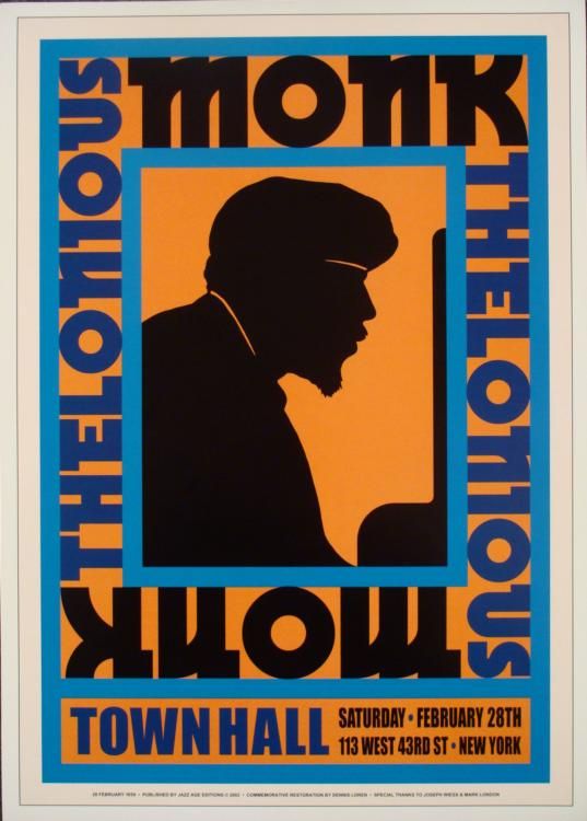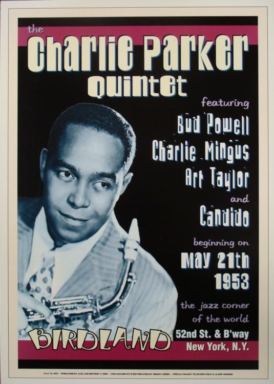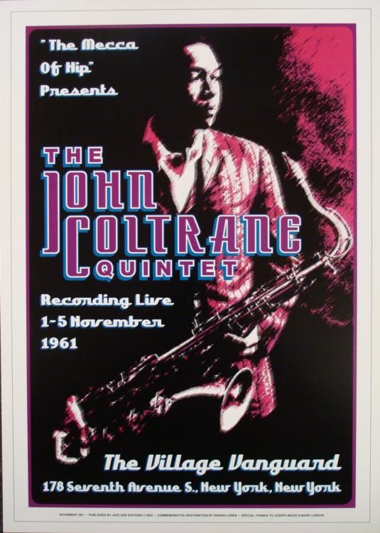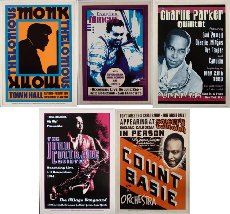 This is a group of 5 reproductions of original concert posters from some of the most famous names in jazz. * Size: 17" x 24Medium: Heavy Poster Stock Condition: Excellent The artists include: Count Basie and his Orchestra, Sweet's Ballroom, Oakland, 1939Charlie Parker Quintet, Birdland, New York, 1953Thelonious Monk, Town Hall, New York, 1959John Coltrane Quintet, The Village Vanguard, New York, 1961Charles Mingus, Jazz Workshop, San Francisco, 1964Please note: These are reproductions, not original concert posters *