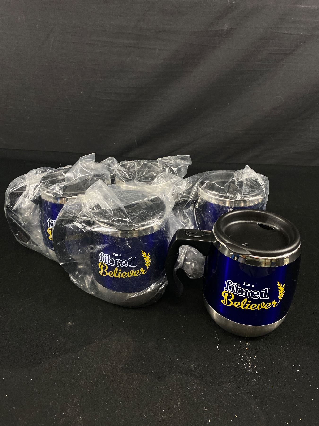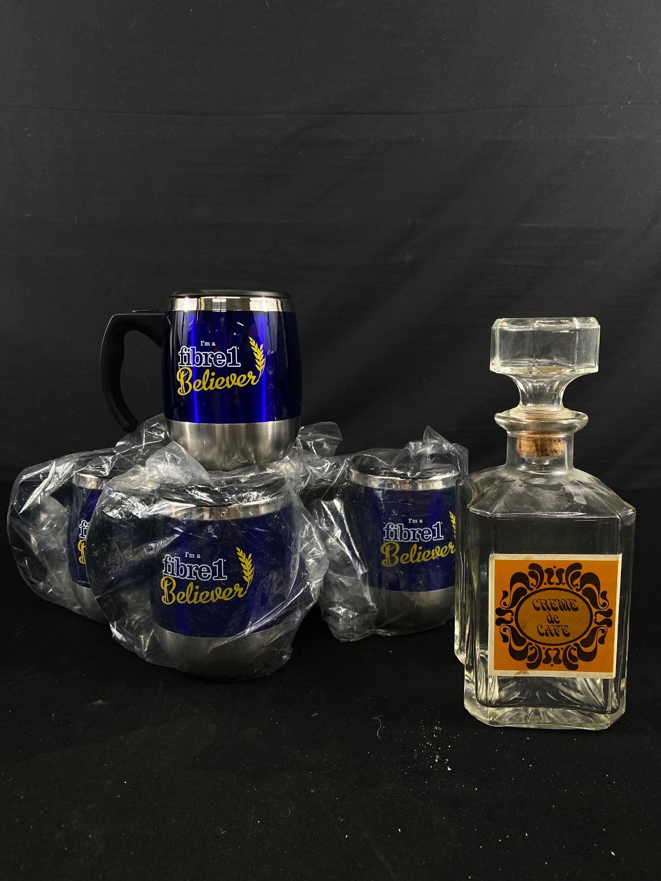 5 Fibre 1 Metal Mugs w/Lids & 1 Glass Decanter
