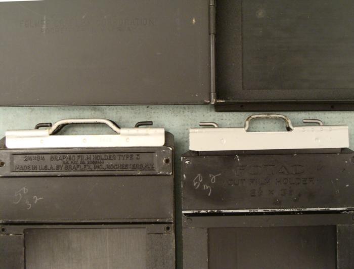 Here are 5 Cut Film Holders for a Mini 2 1/4 x 3 1/4 Camera. One is for paper negatives, and has a hinged door that opens. The other four have two slides each. Two are Fotac, one is a Graflex Type 5, and the others are unmarked. They appear to be in very good condition.