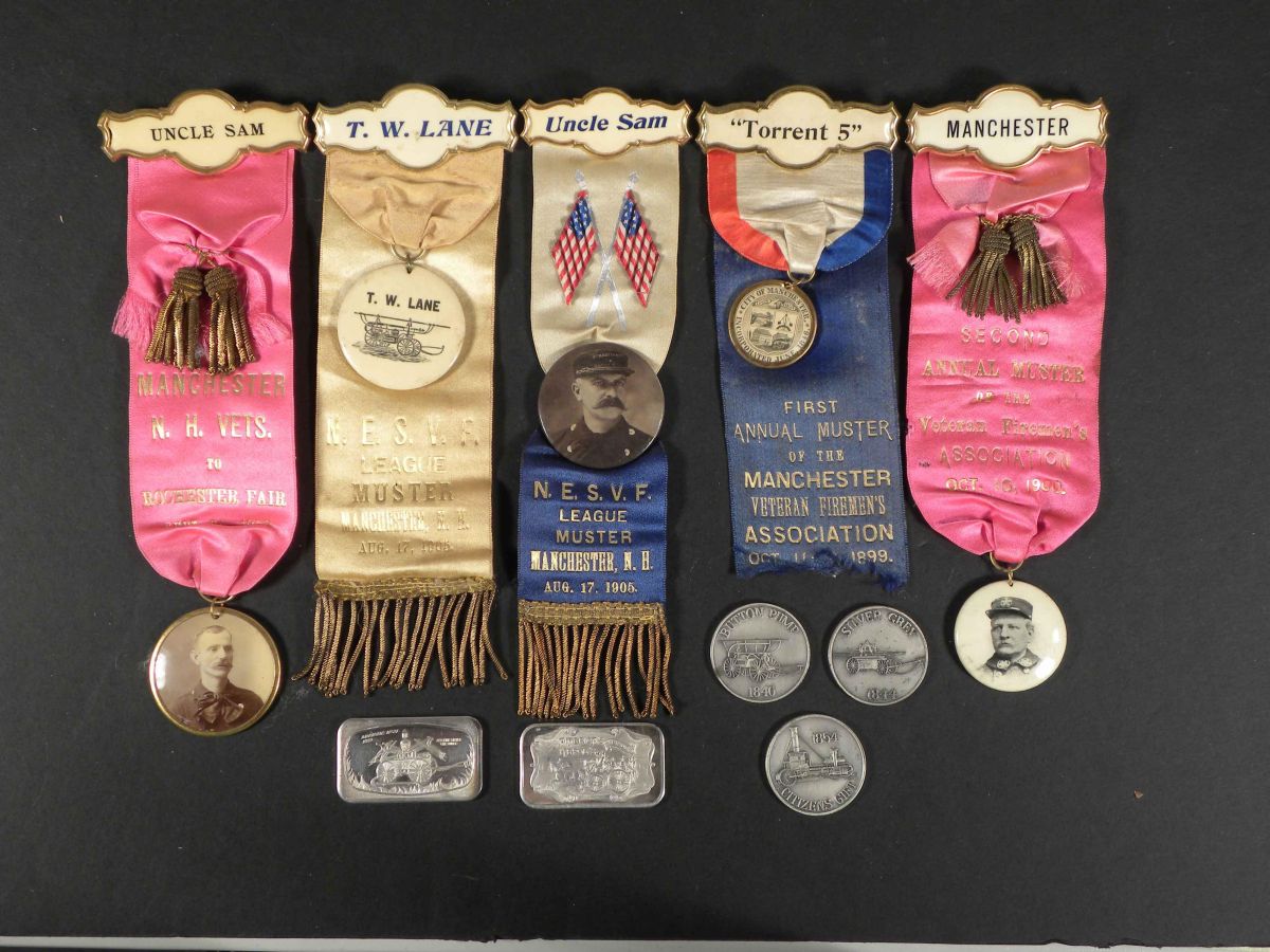 Lot of 5 Firemen's Convention/Muster Ribbons/Badges. Three commemorative medallions and two silver bars with embossed pumpers(contemporary). Ribbons date 1899-1905. Various sizes and condition.