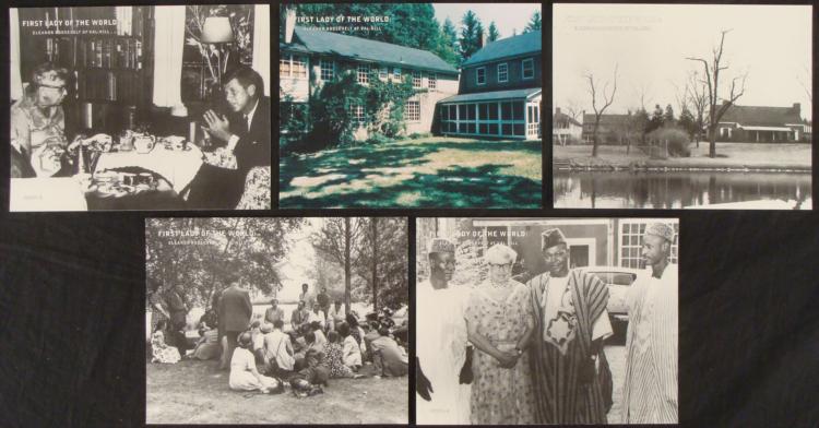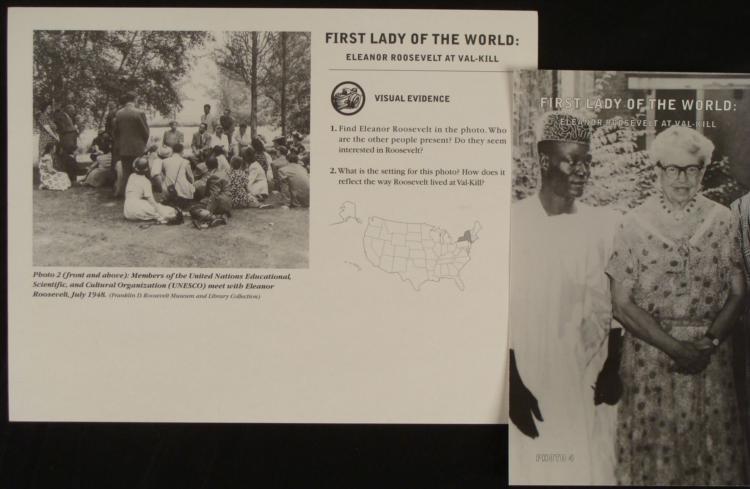 This is a set of 8 1/4" x 10 1/2" photo cards from a series titled "First Lady of the World: Eleanor Roosevelt at Val-Kill." The photos show her welcoming international visitors to her family cottage retreat. Eleanor Roosevelt sometimes hosted workshops for Encampment for Citizenship here. Each photo has information on back, and questions that show these were used for educational purposes. They are in excellent condition.