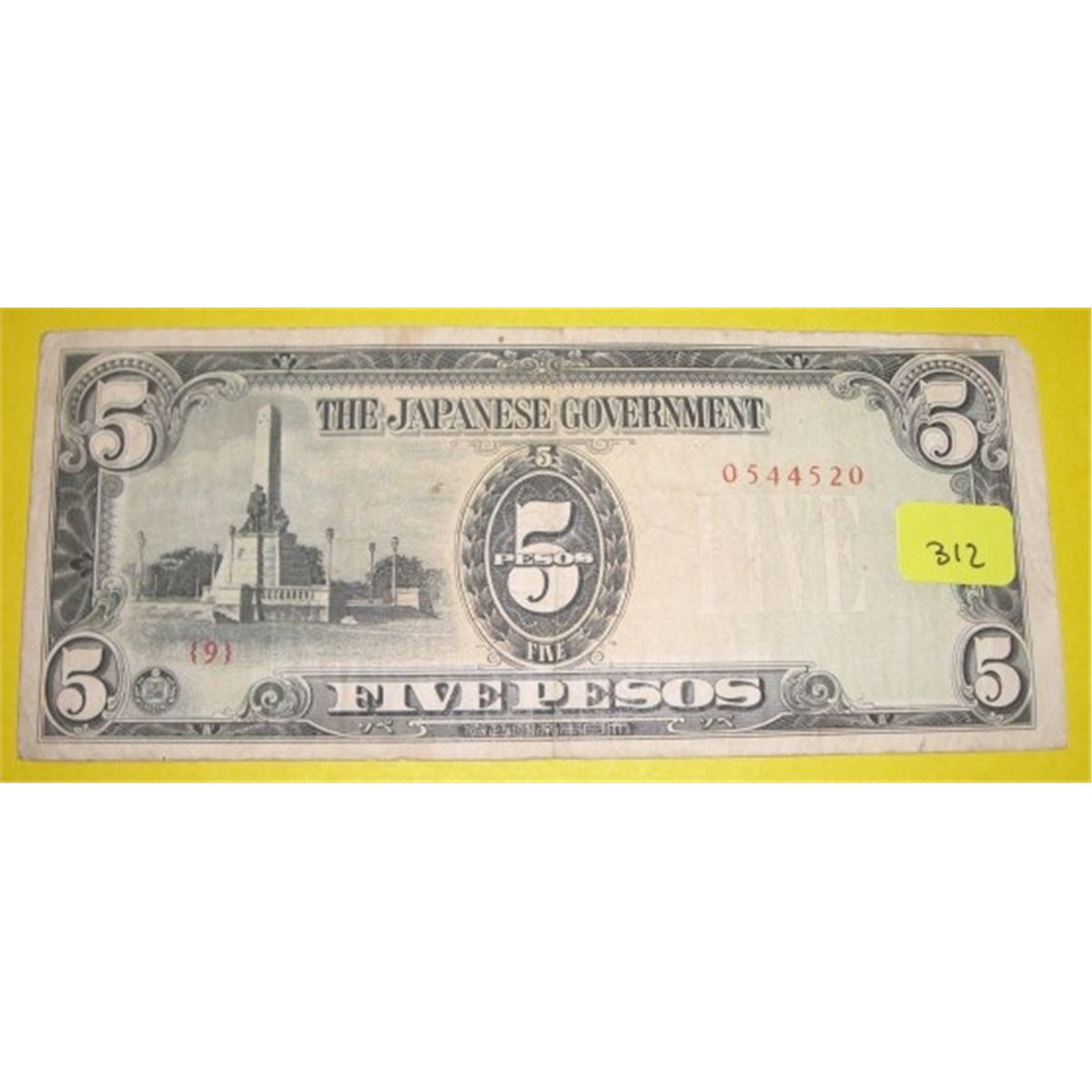 $5 Five Pesos World War II Japanese Occupational Currency *RARE AU GRADE* Serial # 0544520!! ***Coin & Currency Grades, Conditions & Values are not Safe Deposit Coins Responsibilty. Grades, Conditions & Values are determined by Consigner(s) & Buyers***